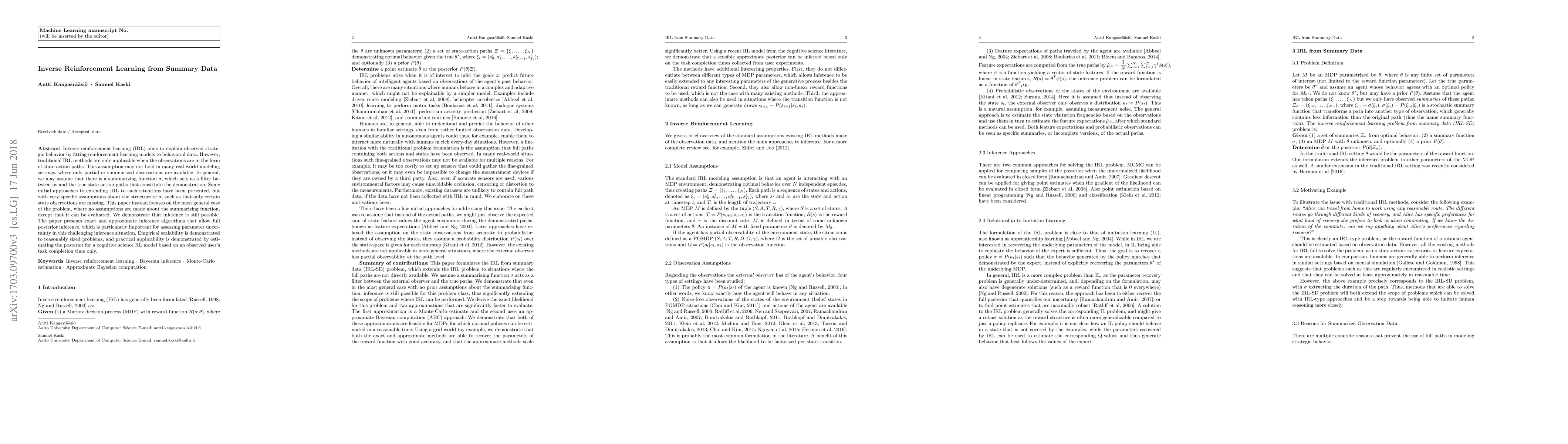 Inverse reinforcement learning (IRL) aims to explain observed strategic behavior by fitting reinforcement learning models to behavioral data. However, traditional IRL methods are only applicable when the observations are in the form of state-action paths. This assumption may not hold in many real-world modeling settings, where only partial or summarized observations are available. In general, we may assume that there is a summarizing function $\sigma$, which acts as a filter between us and the true state-action paths that constitute the demonstration. Some initial approaches to extending IRL to such situations have been presented, but with very specific assumptions about the structure of $\sigma$, such as that only certain state observations are missing. This paper instead focuses on the most general case of the problem, where no assumptions are made about the summarizing function, except that it can be evaluated. We demonstrate that inference is still possible. The paper presents exact and approximate inference algorithms that allow full posterior inference, which is particularly important for assessing parameter uncertainty in this challenging inference situation. Empirical scalability is demonstrated to reasonably sized problems, and practical applicability is demonstrated by estimating the posterior for a cognitive science RL model based on an observed user's task completion time only.