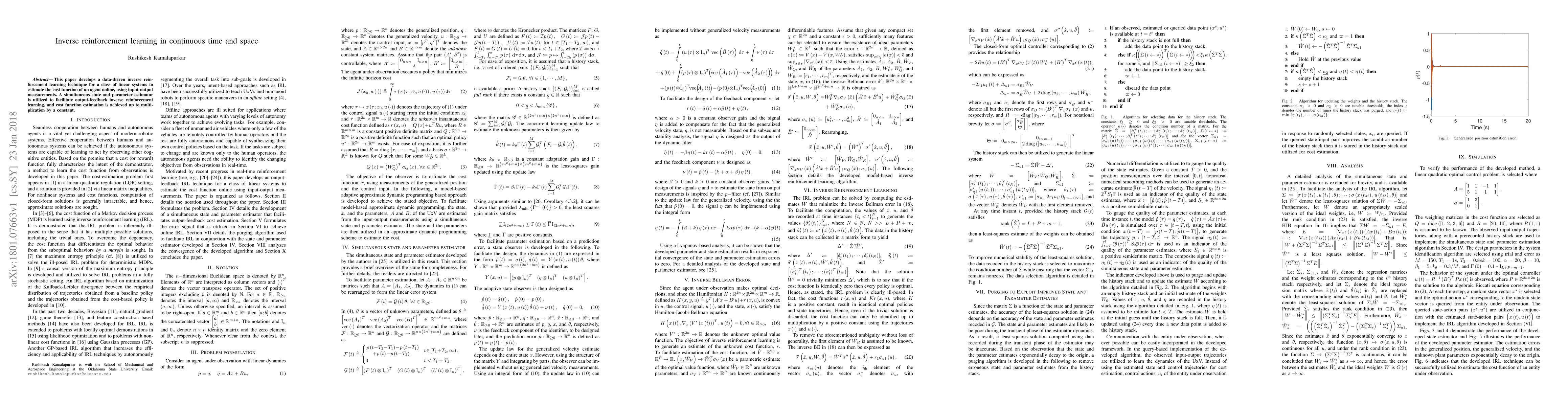 This paper develops a data-driven inverse reinforcement learning technique for a class of linear systems to estimate the cost function of an agent online, using input-output measurements. A simultaneous state and parameter estimator is utilized to facilitate output-feedback inverse reinforcement learning, and cost function estimation is achieved up to multiplication by a constant.