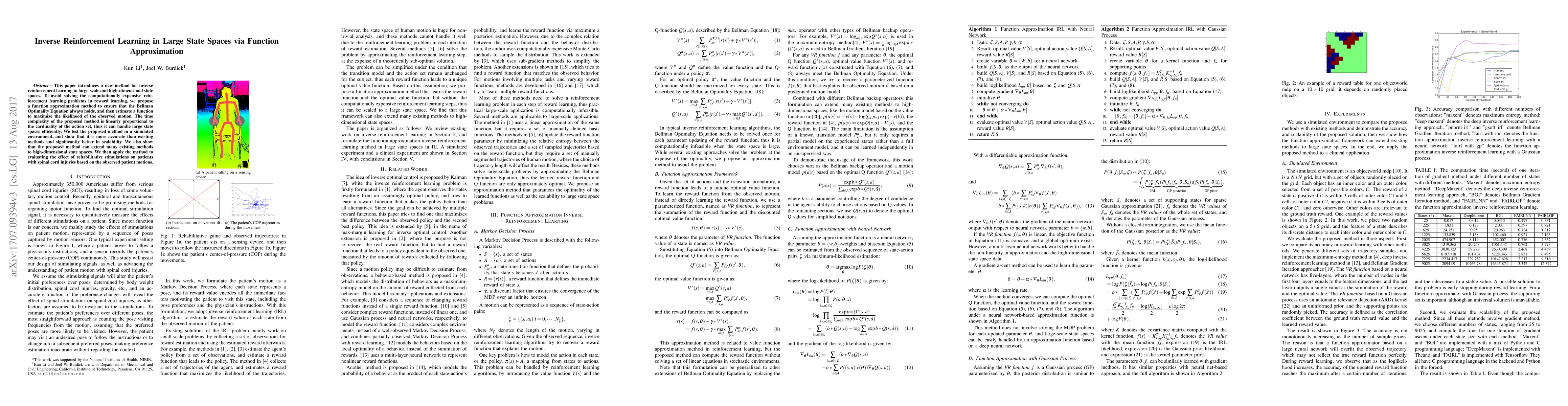This paper introduces a new method for inverse reinforcement learning in large-scale and high-dimensional state spaces. To avoid solving the computationally expensive reinforcement learning problems in reward learning, we propose a function approximation method to ensure that the Bellman Optimality Equation always holds, and then estimate a function to maximize the likelihood of the observed motion. The time complexity of the proposed method is linearly proportional to the cardinality of the action set, thus it can handle large state spaces efficiently. We test the proposed method in a simulated environment, and show that it is more accurate than existing methods and significantly better in scalability. We also show that the proposed method can extend many existing methods to high-dimensional state spaces. We then apply the method to evaluating the effect of rehabilitative stimulations on patients with spinal cord injuries based on the observed patient motions.