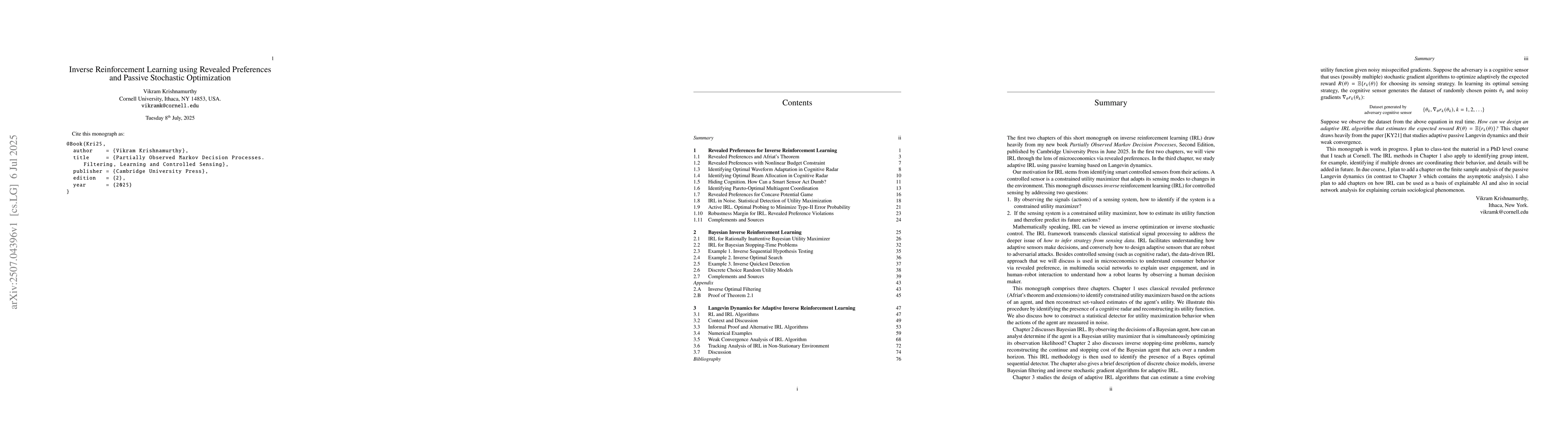 This monograph, spanning three chapters, explores Inverse Reinforcement Learning (IRL). The first two chapters view inverse reinforcement learning (IRL) through the lens of revealed preferences from microeconomics while the third chapter studies adaptive IRL via Langevin dynamics stochastic gradient algorithms. Chapter uses classical revealed preference theory (Afriat's theorem and extensions) to identify constrained utility maximizers based on observed agent actions. This allows for the reconstruction of set-valued estimates of an agent's utility. We illustrate this procedure by identifying the presence of a cognitive radar and reconstructing its utility function. The chapter also addresses the construction of a statistical detector for utility maximization behavior when agent actions are corrupted by noise. Chapter 2 studies Bayesian IRL. It investigates how an analyst can determine if an observed agent is a rationally inattentive Bayesian utility maximizer (i.e., simultaneously optimizing its utility and observation likelihood). The chapter discusses inverse stopping-time problems, focusing on reconstructing the continuation and stopping costs of a Bayesian agent operating over a random horizon. We then apply this IRL methodology to identify the presence of a Bayes-optimal sequential detector. Additionally, Chapter 2 provides a concise overview of discrete choice models, inverse Bayesian filtering, and inverse stochastic gradient algorithms for adaptive IRL. Finally, Chapter 3 introduces an adaptive IRL approach utilizing passive Langevin dynamics. This method aims to track time-varying utility functions given noisy and misspecified gradients. In essence, the adaptive IRL algorithms presented in Chapter 3 can be conceptualized as inverse stochastic gradient algorithms, as they learn the utility function in real-time while a stochastic gradient algorithm is in operation.