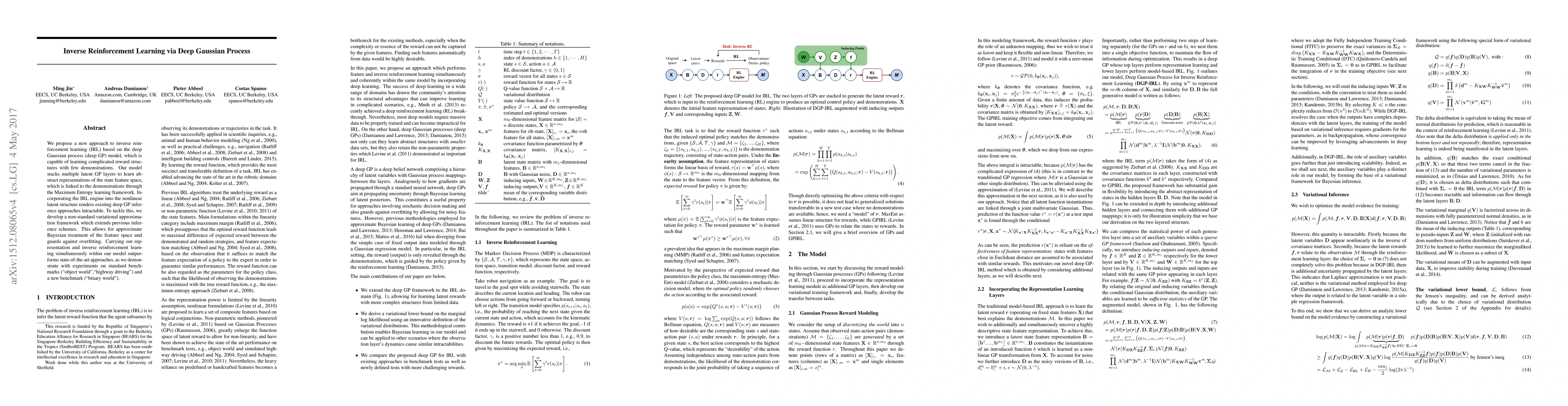 This paper introduces a novel inverse reinforcement learning method using a deep Gaussian process model, which stacks multiple latent GP layers to learn complex reward structures from limited demonstrations. The proposed non-standard variational approximation framework enables efficient inference and outperforms existing state-of-the-art methods on various benchmarks.