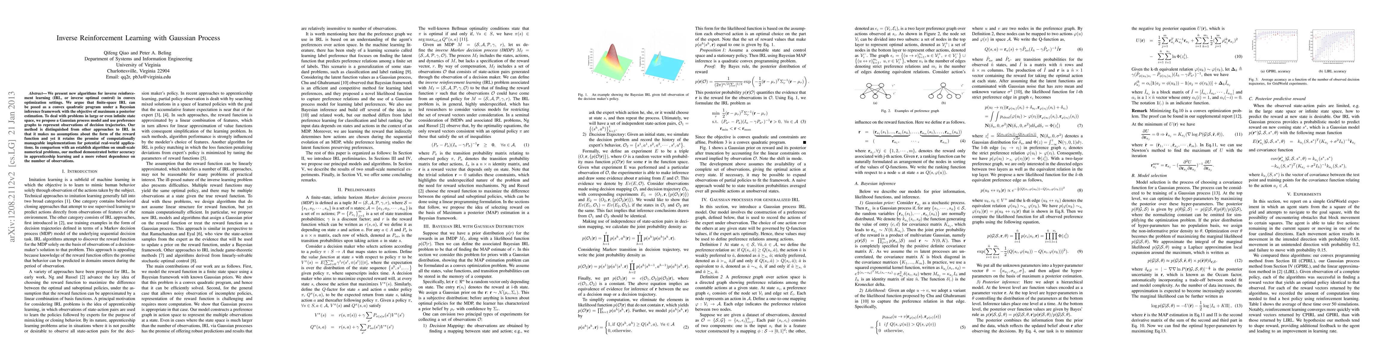 This paper introduces new algorithms for inverse reinforcement learning in convex optimization settings, framing it as a convex quadratic program under a Bayesian inference framework. It employs Gaussian process models and preference graphs to handle large or infinite state spaces, offering a flexible approach without assumptions about the reward function, and shows improved accuracy and robustness compared to established methods.