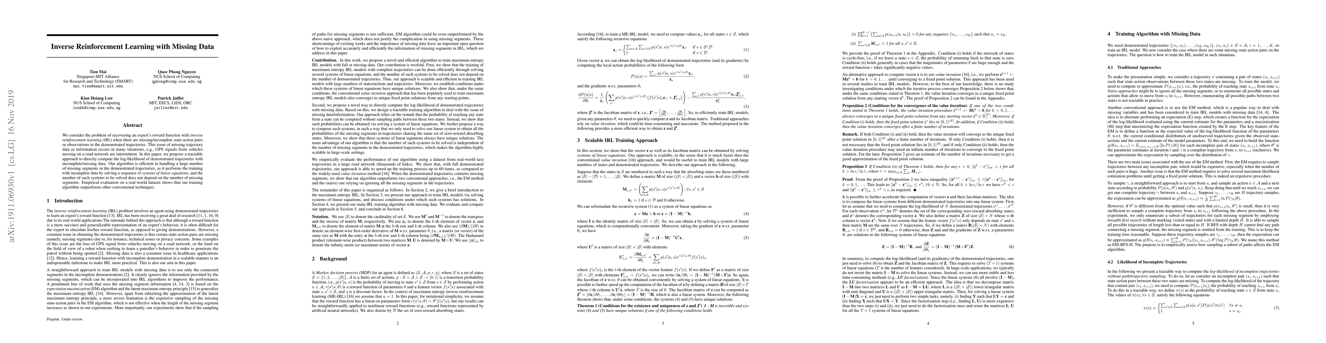 This research introduces a method for Inverse Reinforcement Learning (IRL) that effectively handles missing or incomplete state-action pairs in demonstrated trajectories. The proposed algorithm efficiently computes the log-likelihood of such incomplete data, solving a series of linear equations independent of missing data segments, and demonstrates superior performance on real-world datasets compared to conventional techniques.
