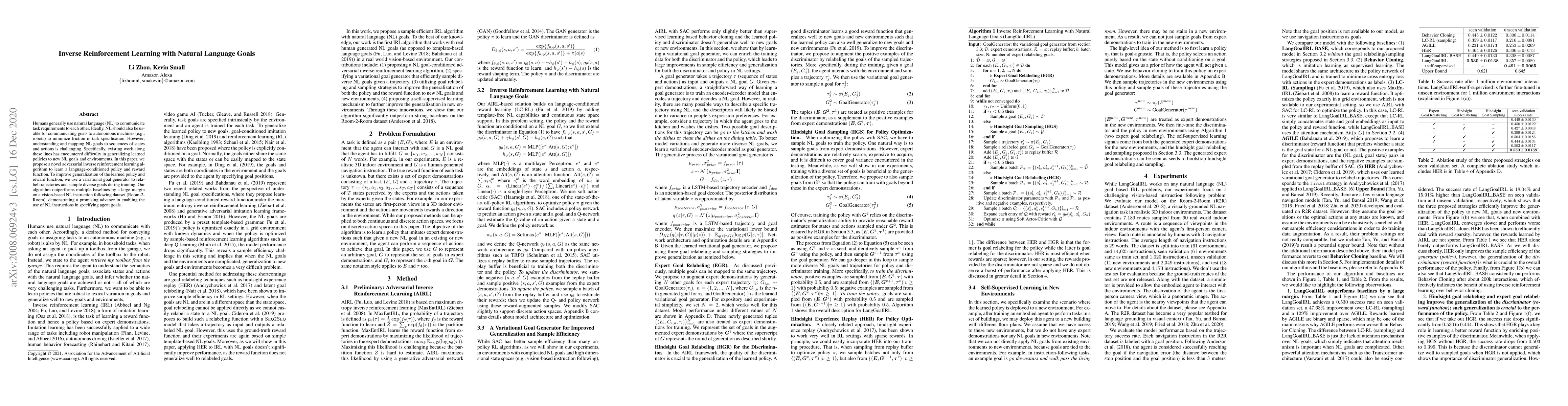 Humans generally use natural language to communicate task requirements to each other. Ideally, natural language should also be usable for communicating goals to autonomous machines (e.g., robots) to minimize friction in task specification. However, understanding and mapping natural language goals to sequences of states and actions is challenging. Specifically, existing work along these lines has encountered difficulty in generalizing learned policies to new natural language goals and environments. In this paper, we propose a novel adversarial inverse reinforcement learning algorithm to learn a language-conditioned policy and reward function. To improve generalization of the learned policy and reward function, we use a variational goal generator to relabel trajectories and sample diverse goals during training. Our algorithm outperforms multiple baselines by a large margin on a vision-based natural language instruction following dataset (Room-2-Room), demonstrating a promising advance in enabling the use of natural language instructions in specifying agent goals.
