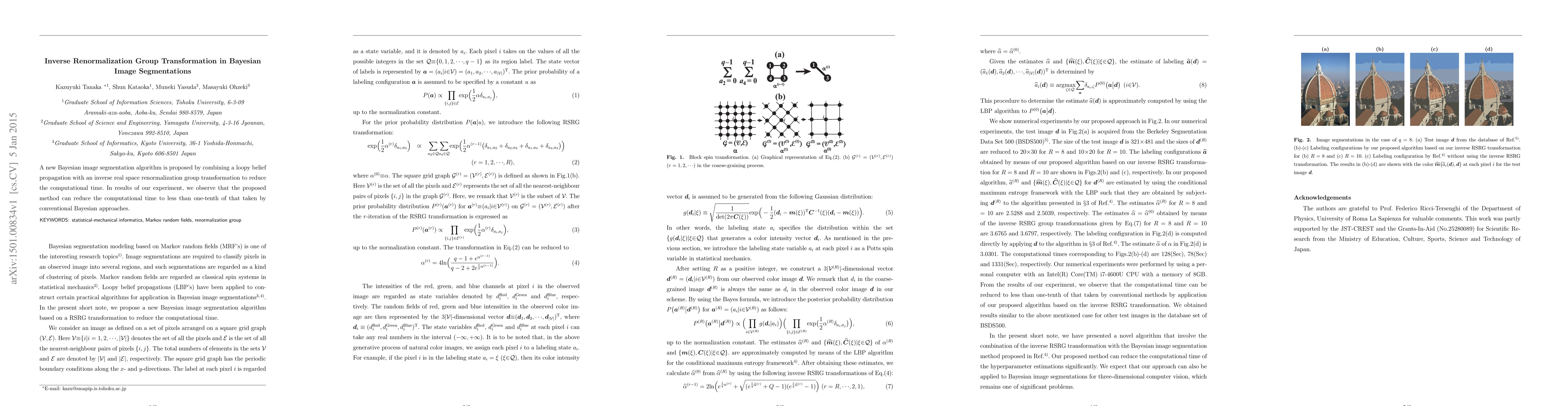 A new Bayesian image segmentation algorithm is proposed by combining a loopy belief propagation with an inverse real space renormalization group transformation to reduce the computational time. In results of our experiment, we observe that the proposed method can reduce the computational time to less than one-tenth of that taken by conventional Bayesian approaches.