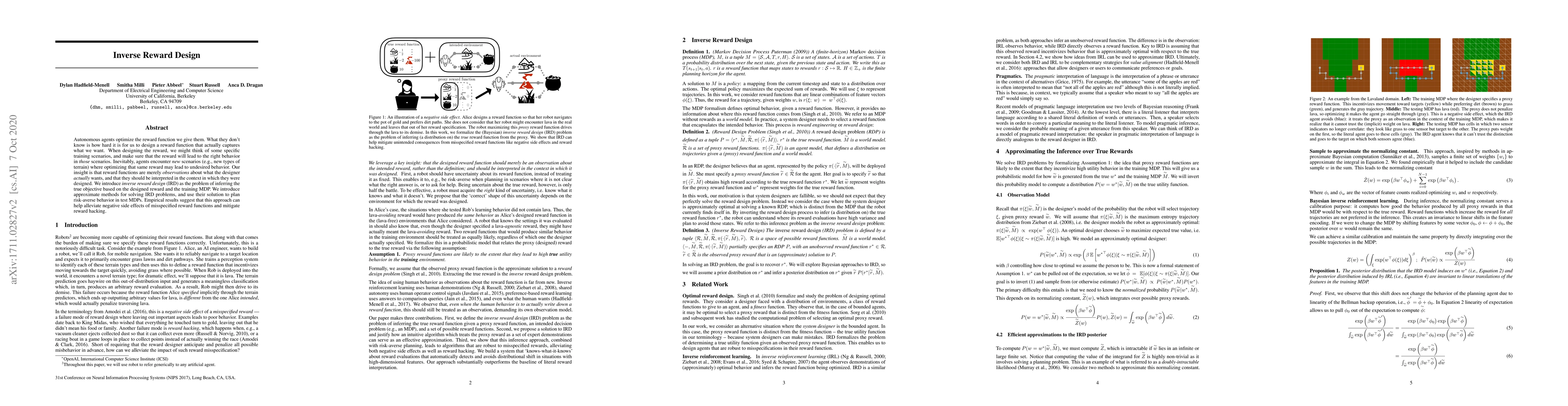 This paper introduces inverse reward design (IRD) to infer the true objectives of agents based on their designed reward functions and training scenarios. It proposes approximate methods to solve IRD problems and demonstrates their effectiveness in mitigating negative side effects and reward hacking through empirical results.