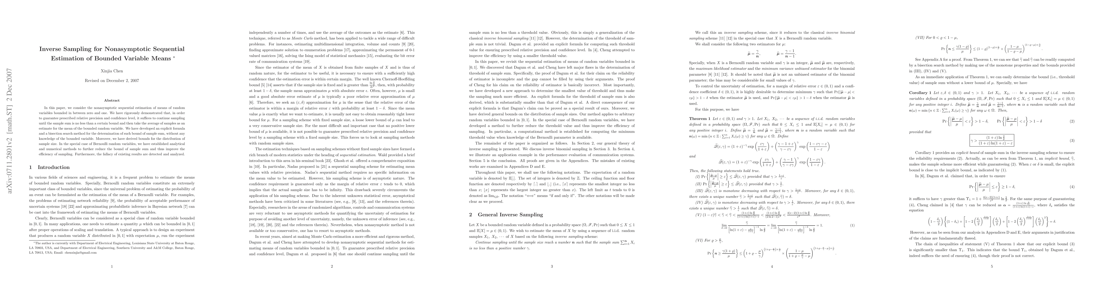 This paper proposes inverse sampling techniques for nonasymptotic sequential estimation of means of bounded random variables between zero and one, providing an explicit formula and a bisection search method to determine the required sample sum bound without prior knowledge of the variable. It also detects and critiques existing results.