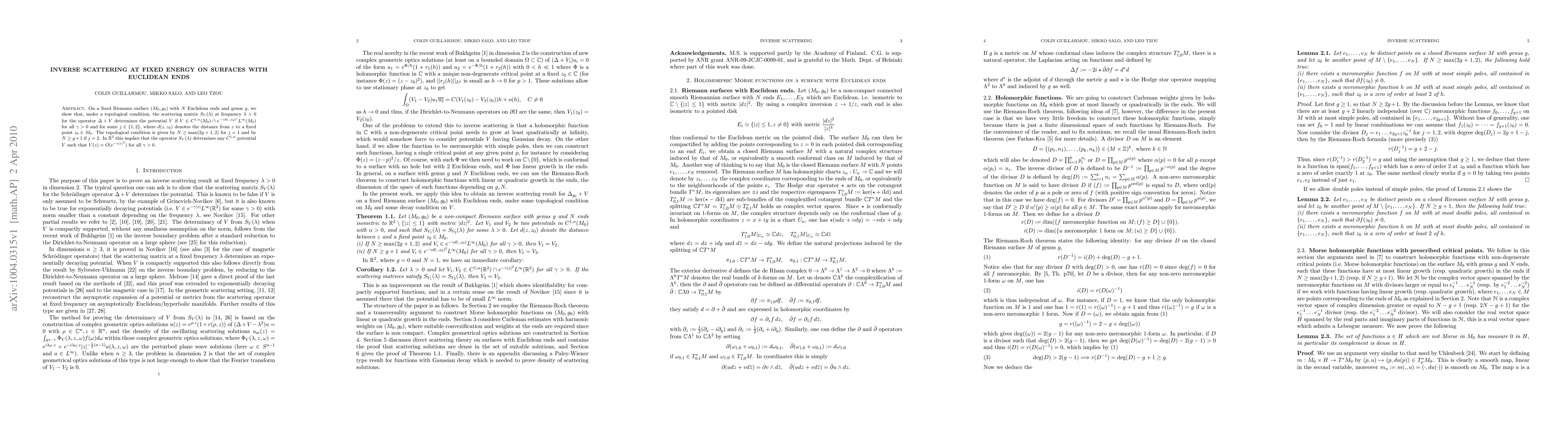 On a fixed Riemann surface $(M_0,g_0)$ with $N$ Euclidean ends and genus $g$, we show that, under a topological condition, the scattering matrix $S_V(\la)$ at frequency $\la > 0$ for the operator $\Delta+V$ determines the potential $V$ if $V\in C^{1,\alpha}(M_0)\cap e^{-\gamma d(\cdot,z_0)^j}L^\infty(M_0)$ for all $\gamma>0$ and for some $j\in\{1,2\}$, where $d(z,z_0)$ denotes the distance from $z$ to a fixed point $z_0\in M_0$. The topological condition is given by $N\geq\max(2g+1,2)$ for $j=1$ and by $N\geq g+1$ if $j=2$. In $\rr^2$ this implies that the operator $S_V(\la)$ determines any $C^{1,\alpha}$ potential $V$ such that $V(z)=O(e^{-\gamma|z|^2})$ for all $\gamma>0$.