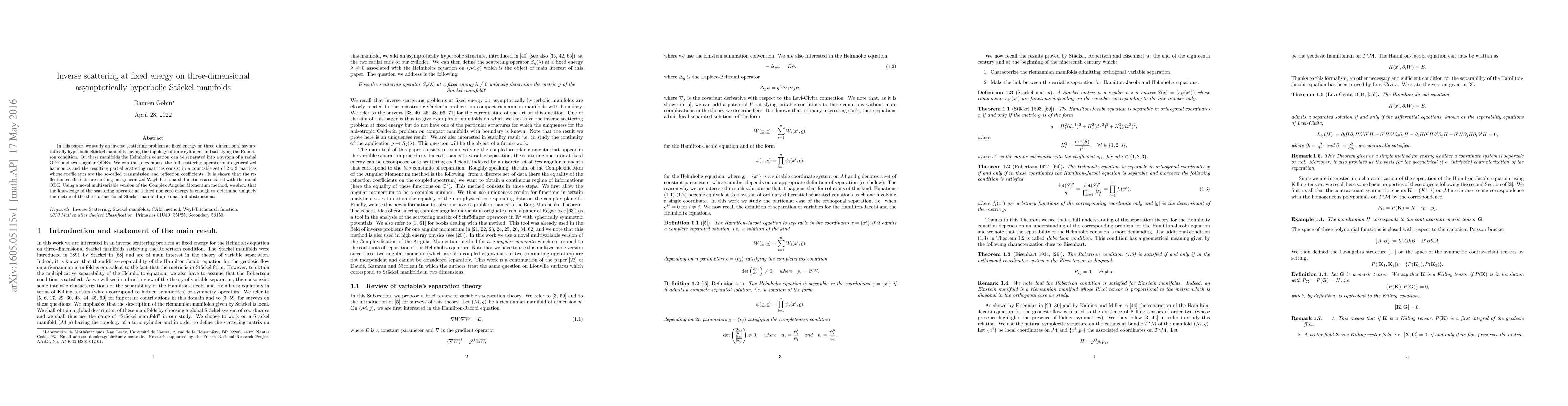 This paper investigates an inverse scattering problem at fixed energy on three-dimensional asymptotically hyperbolic St{\"a}ckel manifolds, demonstrating that the scattering operator's knowledge uniquely determines the manifold's metric up to natural obstructions, utilizing a novel multivariable Complex Angular Momentum method.