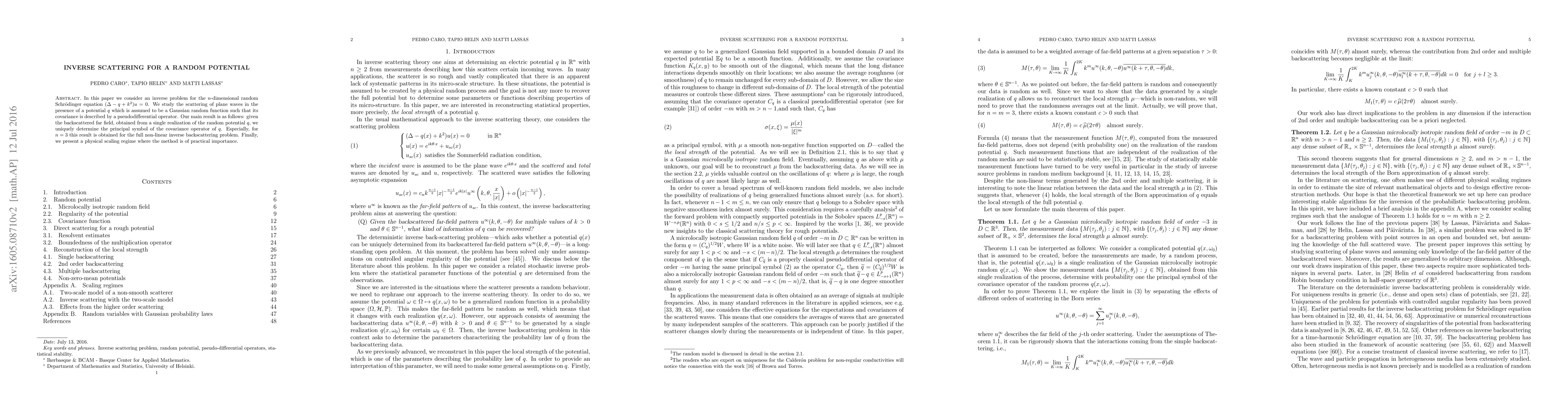 In this paper we consider an inverse problem for the $n$-dimensional random Schr\"{o}dinger equation $(\Delta-q+k^2)u = 0$. We study the scattering of plane waves in the presence of a potential $q$ which is assumed to be a Gaussian random function such that its covariance is described by a pseudodifferential operator. Our main result is as follows: given the backscattered far field, obtained from a single realization of the random potential $q$, we uniquely determine the principal symbol of the covariance operator of $q$. Especially, for $n=3$ this result is obtained for the full non-linear inverse backscattering problem. Finally, we present a physical scaling regime where the method is of practical importance.