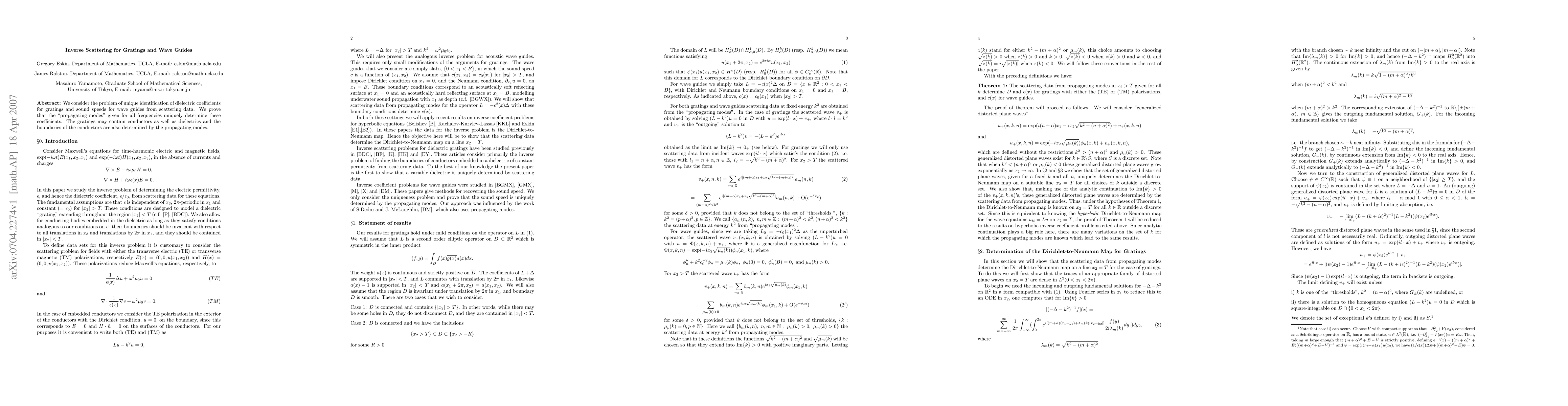 This paper proves that scattering data from "propagating modes" at all frequencies uniquely identifies dielectric coefficients for gratings and sound speeds for wave guides, including the determination of conductor boundaries within the gratings.