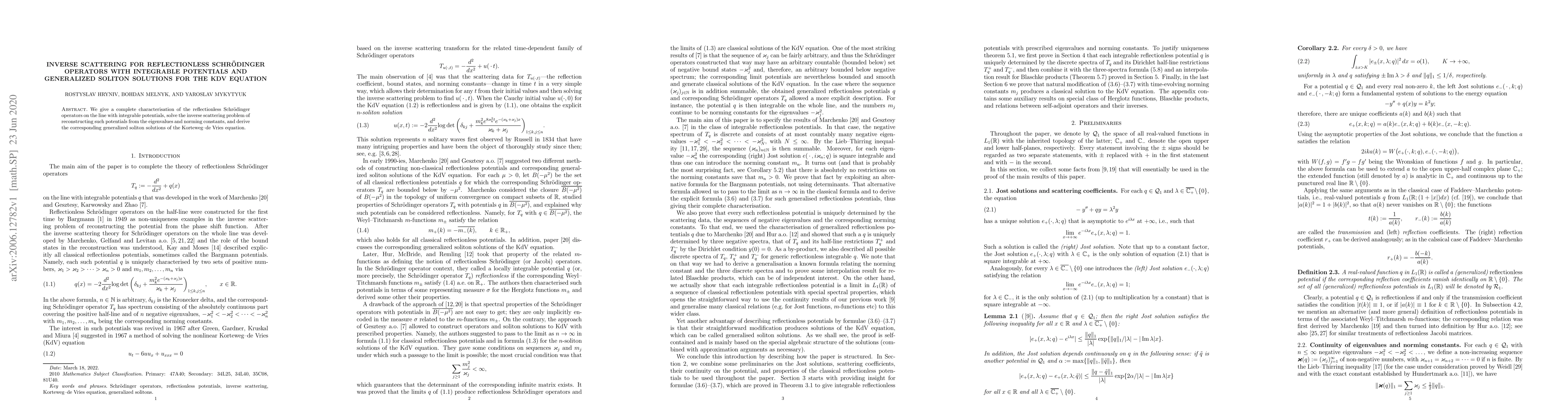 This paper characterizes reflectionless Schrödinger operators with integrable potentials, solves the inverse scattering problem to reconstruct these potentials, and derives generalized soliton solutions for the KdV equation.
