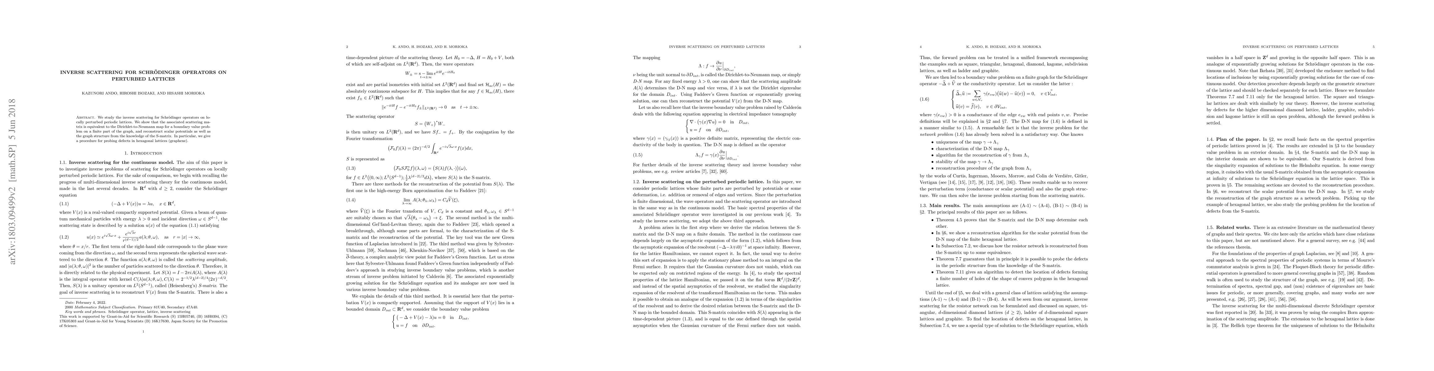 This paper investigates the inverse scattering problem for Schrödinger operators on locally perturbed periodic lattices, demonstrating that the scattering matrix corresponds to the Dirichlet-to-Neumann map for boundary value problems on finite graph sections. It provides a method to reconstruct scalar potentials and graph structures, including a procedure for detecting defects in hexagonal lattices like graphene.