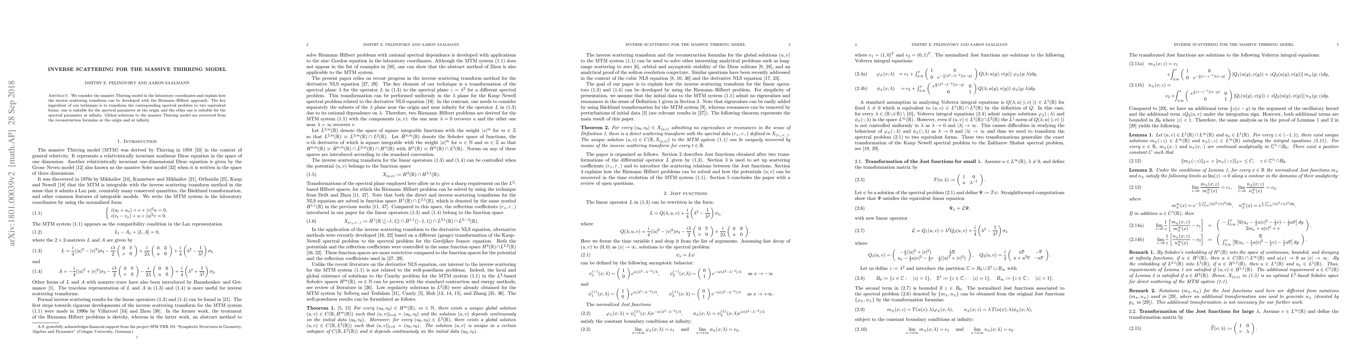 This paper develops an inverse scattering method for the massive Thirring model using the Riemann-Hilbert approach, transforming the spectral problem into forms suitable for the spectral parameter at the origin and infinity, and then reconstructs global solutions from these transformations.
