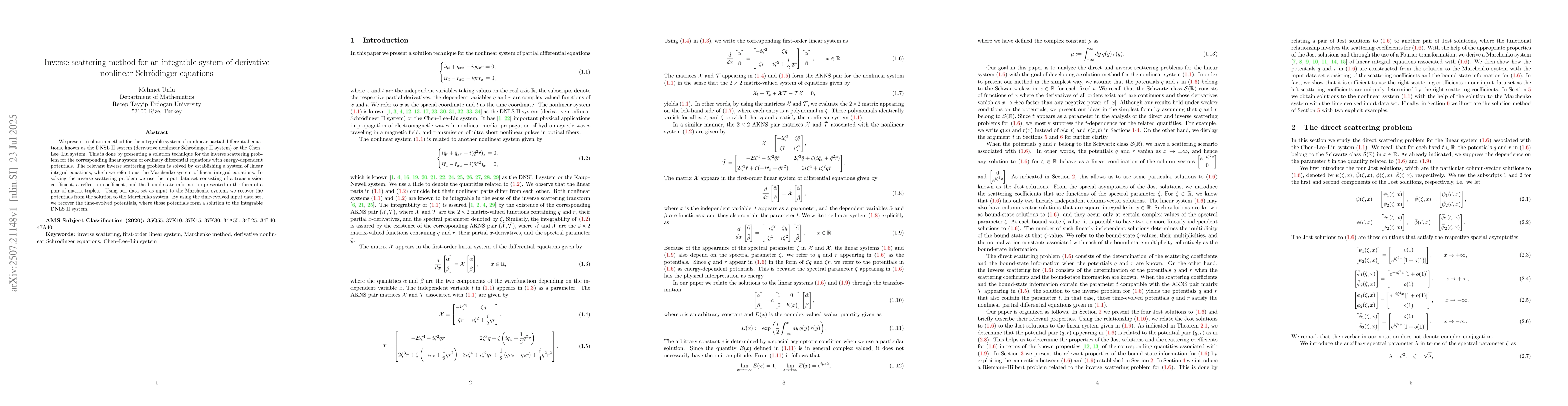 We present a solution method for the integrable system (derivative nonlinear Schr\"odinger II system) or the Chen--Lee--Liu system. This is done by presenting a solution technique for the inverse scattering problem for the corresponding linear system of ordinary differential equations with energy-dependent potentials. The relevant inverse scattering problem is solved by establishing a system of linear integral equations, which we refer to as the Marchenko system of linear integral equations. In solving the inverse scattering problem we use the input data set consisting of a transmission coefficient, a reflection coefficient, and the bound-state information presented in the form of a pair of matrix triplets. Using our data set as input to the Marchenko system, we recover the potentials from the solution to the Marchenko system. By using the time-evolved input data set, we recover the time-evolved potentials, where those potentials form a solution to the integrable DNLS II system.