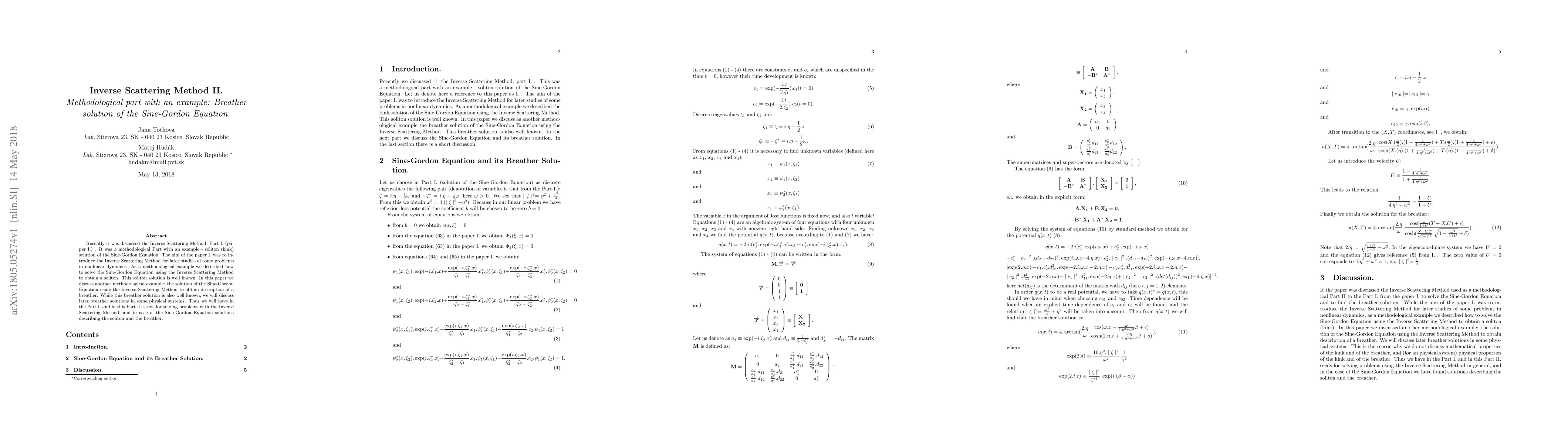 Recently it was discussed the Inverse Scattering Method, Part I. (paper I.) . It was a methodological Part with an example - soliton (kink) solution of the Sine-Gordon Equation. The aim of the paper I. was to introduce the Inverse Scattering Method for later studies of some problems in nonlinear dynamics. As a methodological example we described how to solve the Sine-Gordon Equation using the Inverse Scattering Method to obtain a soliton. This soliton solution is well known. In this paper we discuss another methodological example: the solution of the Sine-Gordon Equation using the Inverse Scattering Method to obtain description of a breather. While this breather solution is also well known, we will discuss later breather solutions in some physical systems. Thus we will have in the Part I. and in this Part II. seeds for solving problems with the Inverse Scattering Method, and in case of the Sine-Gordon Equation solutions describing the soliton and the breather.
