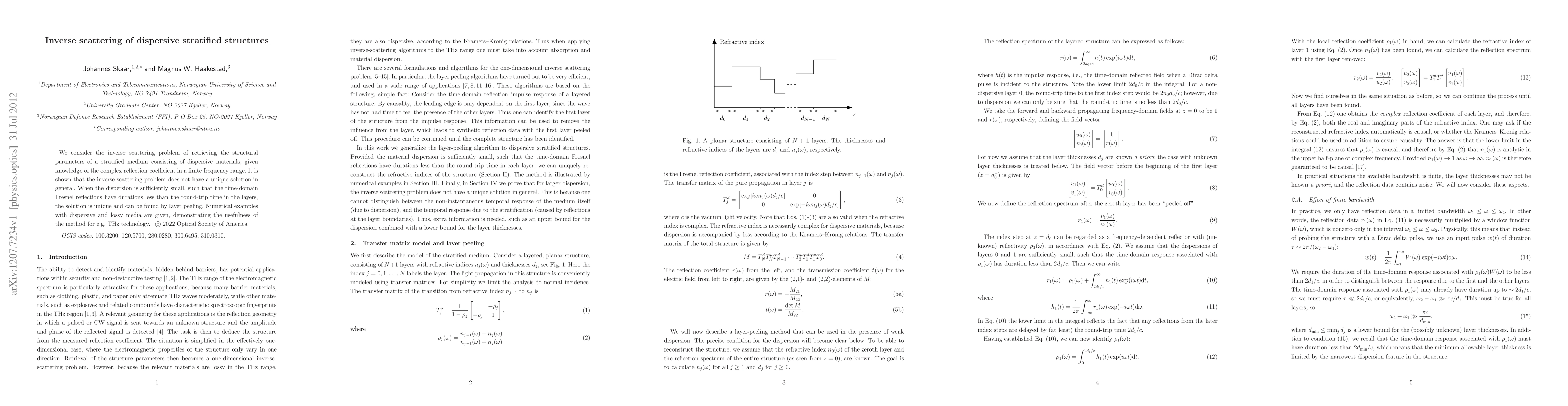 We consider the inverse scattering problem of retrieving the structural parameters of a stratified medium consisting of dispersive materials, given knowledge of the complex reflection coefficient in a finite frequency range. It is shown that the inverse scattering problem does not have a unique solution in general. When the dispersion is sufficiently small, such that the time-domain Fresnel reflections have durations less than the round-trip time in the layers, the solution is unique and can be found by layer peeling. Numerical examples with dispersive and lossy media are given, demonstrating the usefulness of the method for e.g. THz technology.