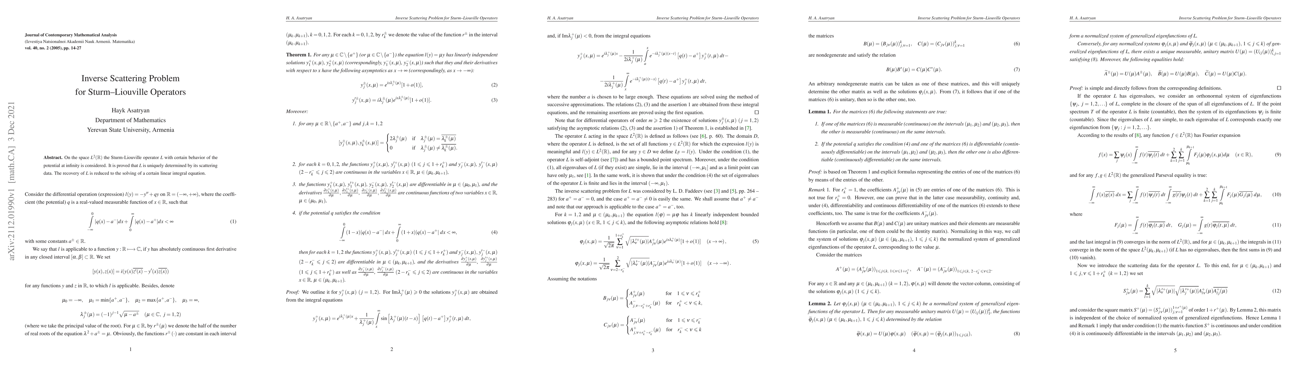 On the space $L^{2}(\mathbb{R})$ the Sturm-Liouville operator $L$ with certain behavior of the potential at infinity is considered. It is proved that $L$ is uniquely determined by its scattering data. The recovery of $L$ is reduced to the solving of a certain linear integral equation.