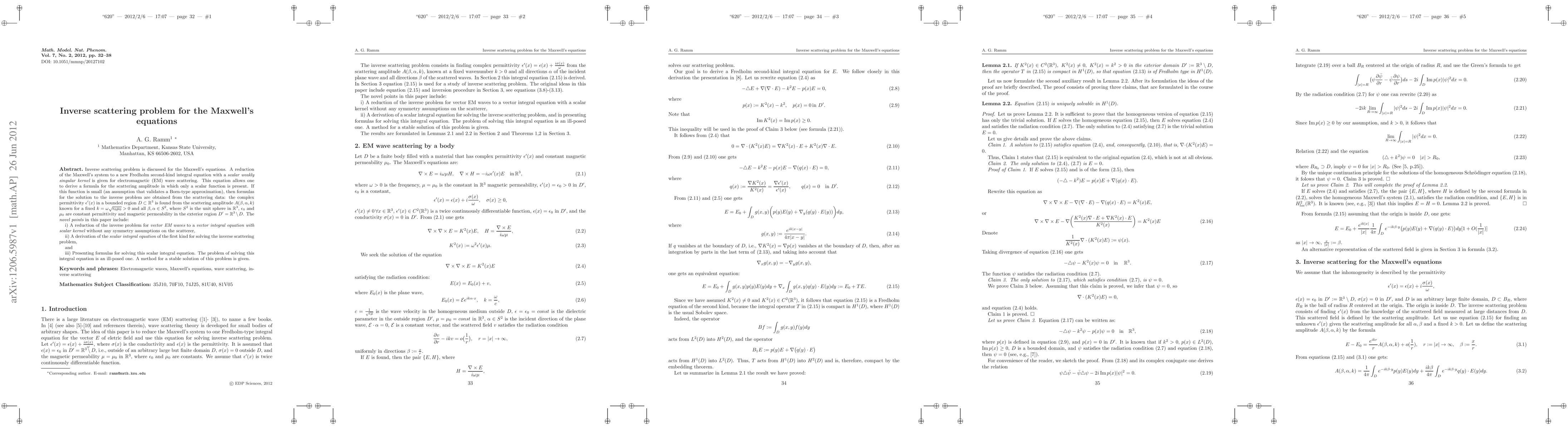Inverse scattering problem is discussed for the Maxwell's equations. A reduction of the Maxwell's system to a new Fredholm second-kind integral equation with a {\it scalar weakly singular kernel} is given for electromagnetic (EM) wave scattering. This equation allows one to derive a formula for the scattering amplitude in which only a scalar function is present. If this function is small (an assumption that validates a Born-type approximation), then formulas for the solution to the inverse problem are obtained from the scattering data: the complex permittivity $\ep'(x)$ in a bounded region $D\subset \R^3$ is found from the scattering amplitude $A(\beta,\alpha,k)$ known for a fixed $k=\omega\sqrt{\ep_0 \mu_0}>0$ and all $\beta,\alpha \in S^2$, where $S^2$ is the unit sphere in $\R^3$, $\ep_0$ and $\mu_0$ are constant permittivity and magnetic permeability in the exterior region $D'=\R^3 \setminus D$. The {\it novel points} in this paper include: i) A reduction of the inverse problem for {\it vector EM waves} to a {\it vector integral equation with scalar kernel} without any symmetry assumptions on the scatterer, ii) A derivation of the {\it scalar integral equation} of the first kind for solving the inverse scattering problem, and iii) Presenting formulas for solving this scalar integral equation. The problem of solving this integral equation is an ill-posed one. A method for a stable solution of this problem is given.