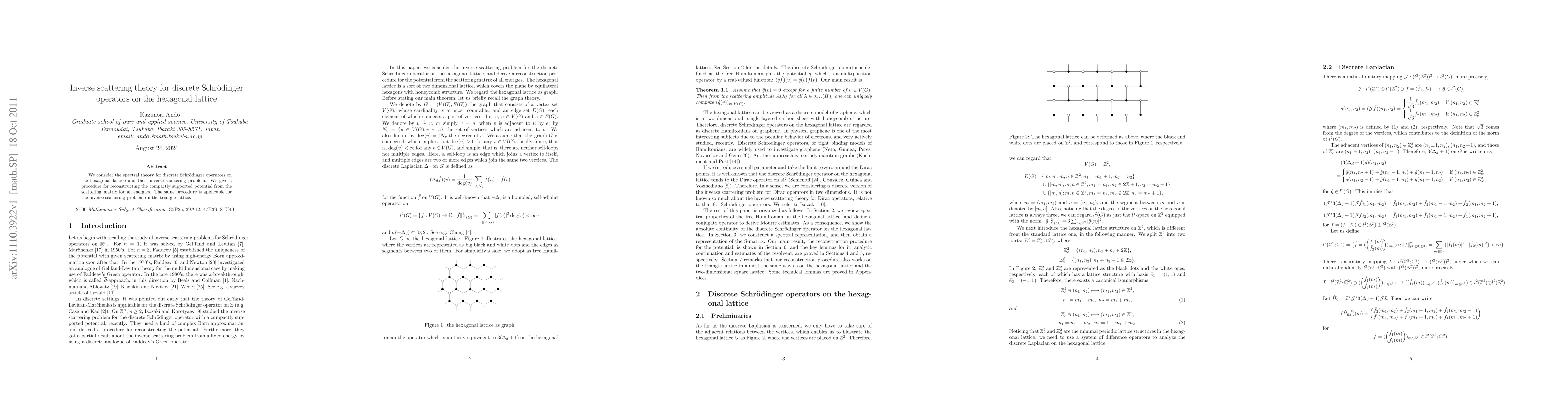 We consider the spectral theory for discrete Schr\"odinger operators on the hexagonal lattice and their inverse scattering problem. We give a procedure for reconstructing the compactly supported potential from the scattering matrix for all energies. The same procedure is applicable for the inverse scattering problem on the triangle lattice.
