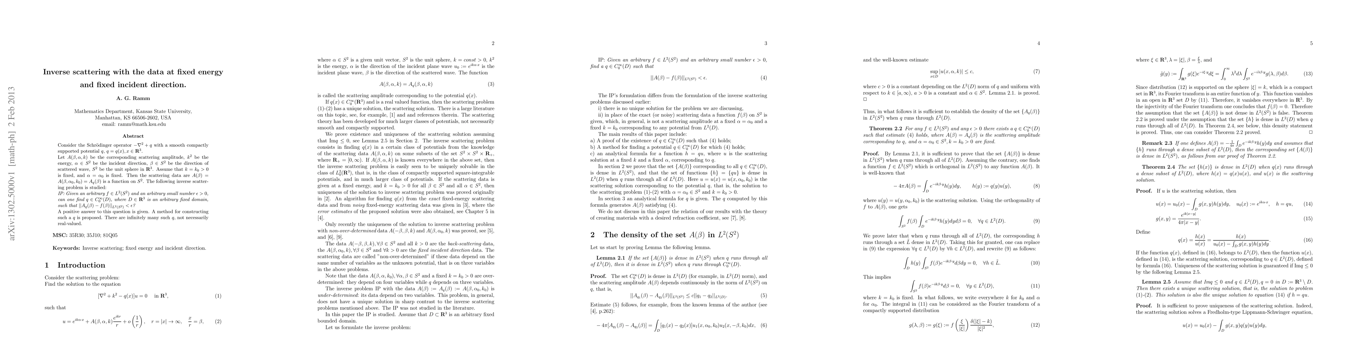 Consider the Schr\"odinger operator $-\nabla^2+q$ $ $q$, $q=q(x), x \in \mathbf{R}^3$. Let $A(\beta,\alpha, k)$ be the corresponding scattering amplitude, $k^2$ be the energy, $\alpha \in S^2$ be the incident direction, $\beta \in S^2$ be the direction of scattered wave, $S^2$ be the unit sphere in $\mathbf{R}^3$. Assume that $k=k_0 >0$ is fixed, and $\alpha=\alpha_0$ is fixed. Then the scattering data are $A(\beta)= A(\beta,\alpha_0, k_0)=A_q(\beta)$ is a function on $S^2$. The following invers$ \textit{IP: Given an arbitrary $f \in L^2(S^2)$ and an arbitrary small number $$ $q \in C_0^{\infty}(D)$, where $D \in \mathbf{R}^3$ is an arbitrary fixed domai$ $||A_q(\beta)-f(\beta)||_{L^2(S^2)} < \epsilon$?} A positive answer to this question is given. A method for constructing such a $q$ is proposed. There are infinitely many such $q$, not necessarily real-valued.