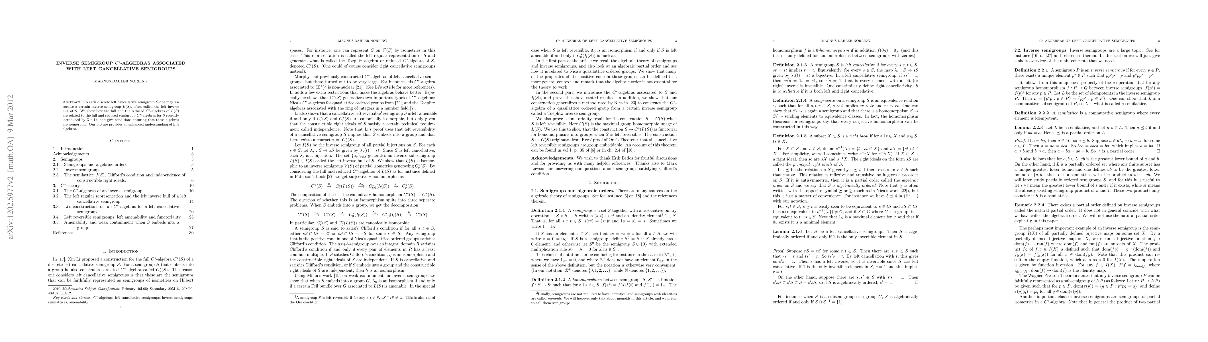 To each discrete left cancellative semigroup $S$ one may associate a certain inverse semigroup $I_l(S)$, often called the left inverse hull of $S$. We show how the full and the reduced C*-algebras of $I_l(S)$ are related to the full and reduced semigroup C*-algebras for $S$ recently introduced by Xin Li, and give conditions ensuring that these algebras are isomorphic. Our picture provides an enhanced understanding of Li's algebras.