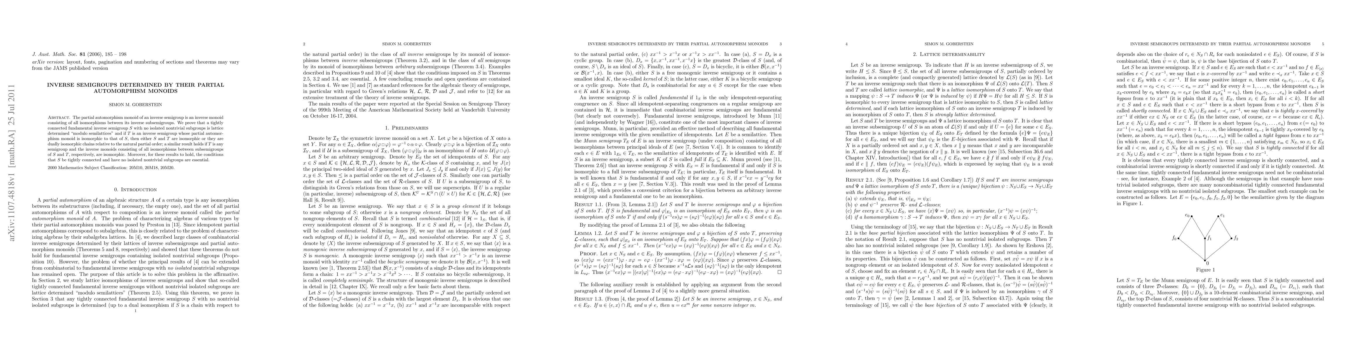 The partial automorphism monoid of an inverse semigroup is an inverse monoid consisting of all isomorphisms between its inverse subsemigroups. We prove that a tightly connected fundamental inverse semigroup $S$ with no isolated nontrivial subgroups is lattice determined "modulo semilattices" and if $T$ is an inverse semigroup whose partial automorphism monoid is isomorphic to that of $S$, then either $S$ and $T$ are isomorphic or they are dually isomorphic chains relative to the natural partial order; a similar result holds if $T$ is any semigroup and the inverse monoids consisting of all isomorphisms between subsemigroups of $S$ and $T$, respectively, are isomorphic. Moreover, for these results to hold, the conditions that $S$ be tightly connected and have no isolated nontrivial subgroups are essential.