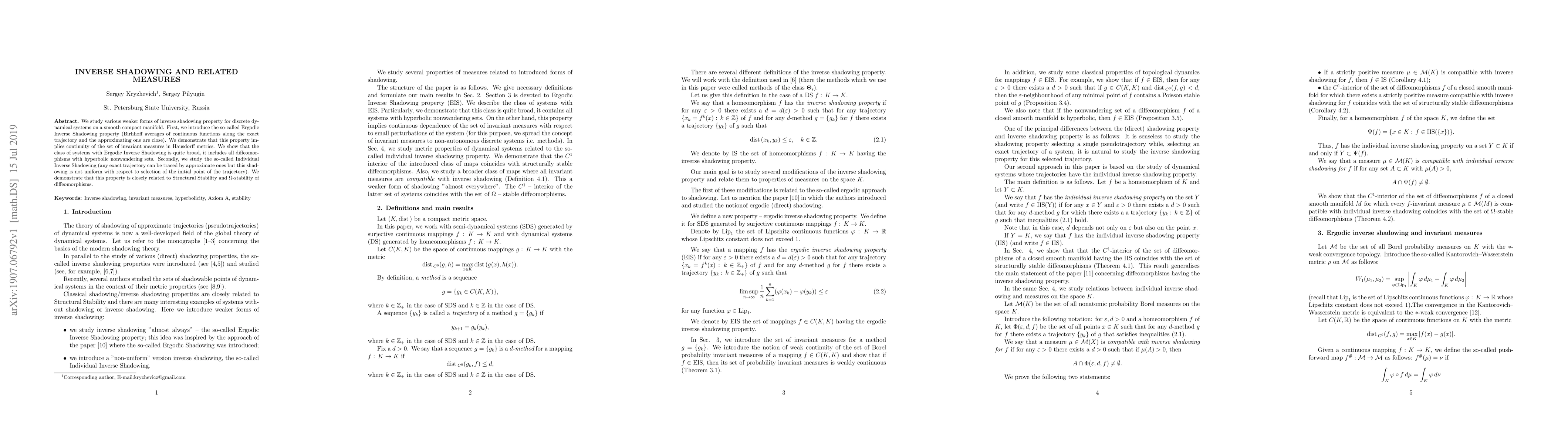 We study various weaker forms of inverse shadowing property for discrete dynamical systems on a smooth compact manifold. First, we introduce the so-called Ergodic Inverse Shadowing property (Birhhoff averages of continuous functions along the exact trajectory and the approximating one are close). We demonstrate that this property implies continuity of the set of invariant measures in Hausdorff metrics. We show that the class of systems with Ergodic Inverse Shadowing is quite broad, it includes all diffeomorphisms with hyperbolic nonwandering sets. Secondly, we study the so-called Individual Inverse Shadowing (any exact trajectory can be traced by approximate ones but this shadowing is not uniform with respect to selection of the initial point of the trajectory). We demonstrate that this property is closely related to Structural Stability and $\Omega$-stability of diffeomorphisms.