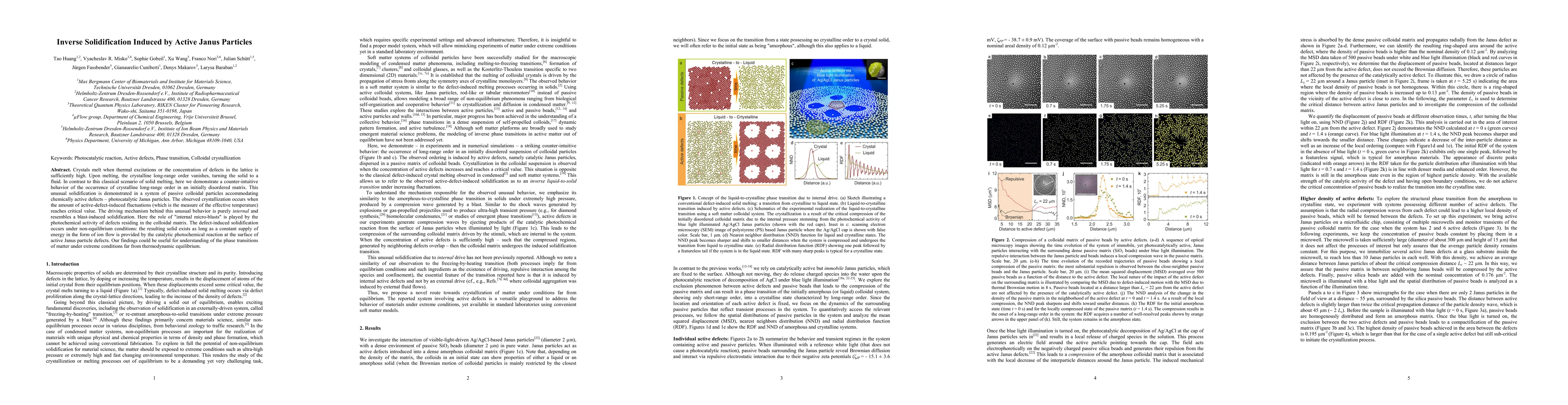 This paper demonstrates an unusual solidification process in a disordered matrix of passive colloidal particles induced by active Janus particles, where internal photochemical reactions create a critical fluctuation level leading to crystalline order. This non-equilibrium solidification, driven by continuous energy supply from catalytic reactions, provides insights into phase transitions under extreme conditions.