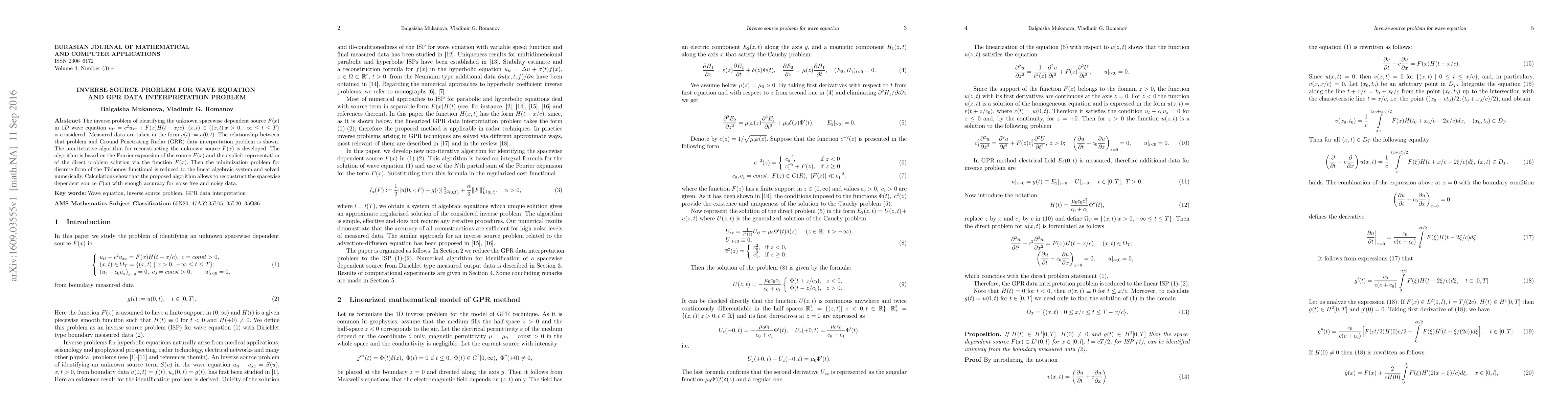 The inverse problem of identifying the unknown spacewise dependent source F(x) in 1D wave equation is considered. Measured data are taken in the form g(t) := u(0; t). The relationship between that problem and Ground Penetrating Radar (GRR) data interpretation problem is shown. The non-iterative algorithm for reconstructing the unknown source F(x) is developed. The algorithm is based on the Fourier expansion of the source F(x) and the explicit representation of the direct problem solution via the function F(x). Then the minimization problem for discrete form of the Tikhonov functional is reduced to the linear algebraic system and solved numerically. Calculations show that the proposed algorithm allows to reconstruct the spacewise dependent source F(x) with enough accuracy for noise free and noisy data.