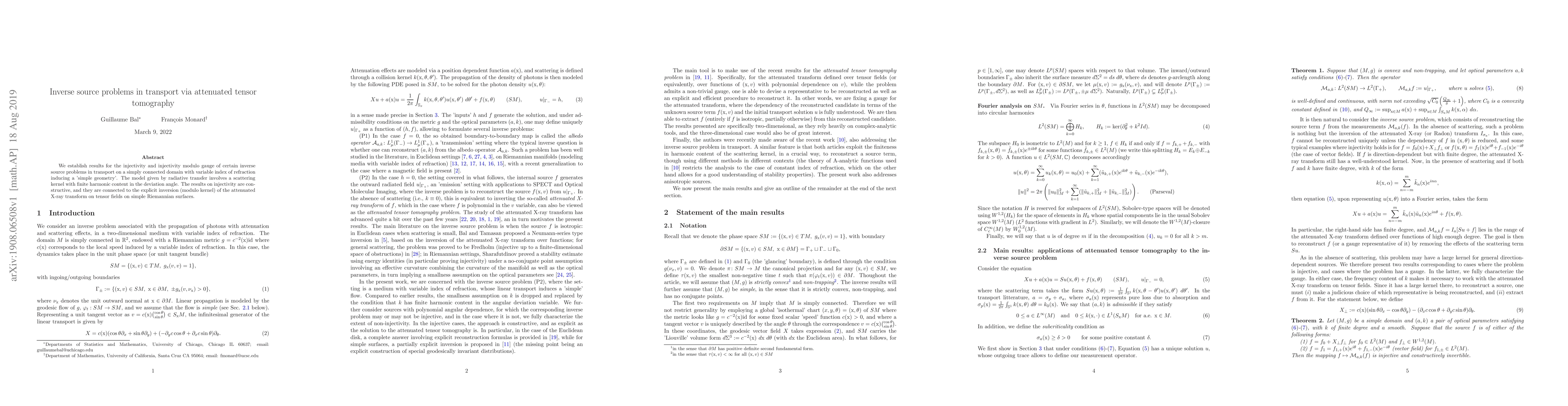 We establish results for the injectivity and injectivity modulo gauge of certain inverse source problems in transport on a simply connected domain with variable index of refraction inducing a 'simple geometry'. The model given by radiative transfer involves a scattering kernel with finite harmonic content in the deviation angle. The results on injectivity are constructive, and they are connected to the explicit inversion (modulo kernel) of the attenuated X-ray transform on tensor fields on simple Riemannian surfaces.