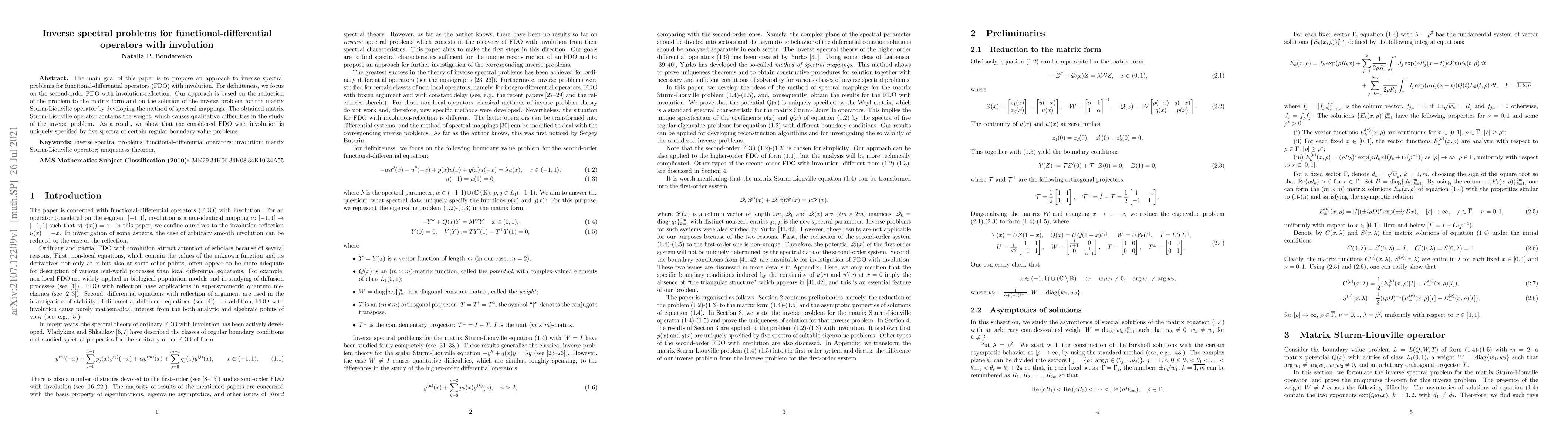 The main goal of this paper is to propose an approach to inverse spectral problems for functional-differential operators (FDO) with involution. For definiteness, we focus on the second-order FDO with involution-reflection. Our approach is based on the reduction of the problem to the matrix form and on the solution of the inverse problem for the matrix Sturm-Liouville operator by developing the method of spectral mappings. The obtained matrix Sturm-Liouville operator contains the weight, which causes qualitative difficulties in the study of the inverse problem. As a result, we show that the considered FDO with involution is uniquely specified by five spectra of certain regular boundary value problems.