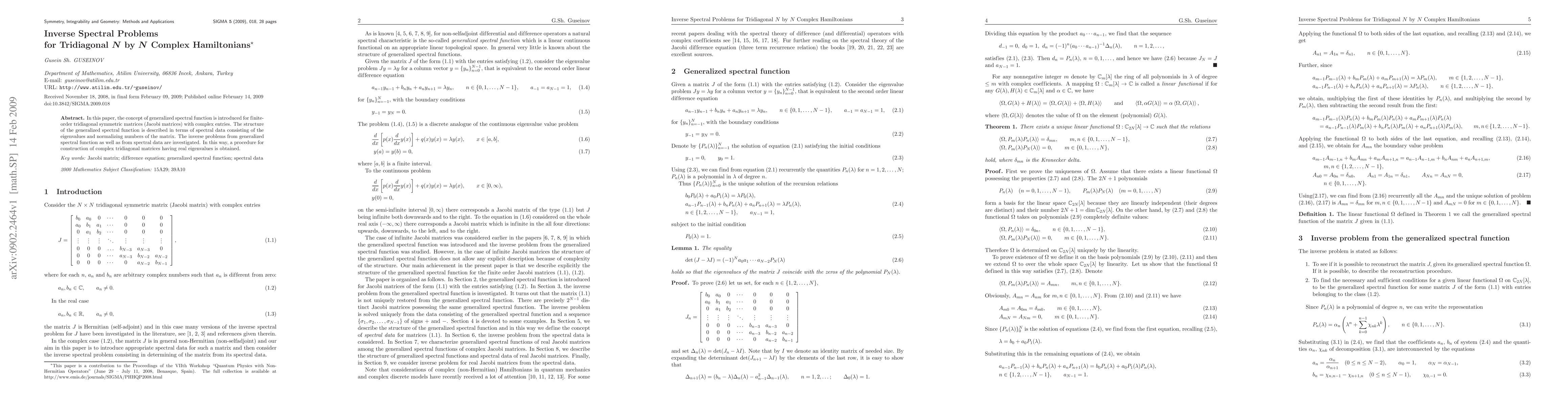 This paper introduces the generalized spectral function for complex tridiagonal symmetric matrices and explores inverse problems to reconstruct such matrices from their spectral data, including eigenvalues and normalizing numbers, leading to a method for constructing matrices with real eigenvalues.