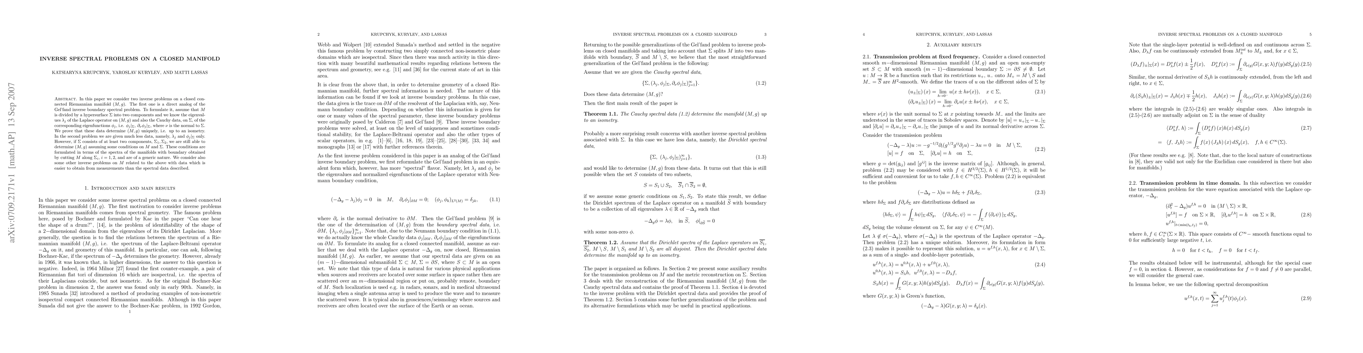 In this paper we consider two inverse problems on a closed connected Riemannian manifold $(M,g)$. The first one is a direct analog of the Gel'fand inverse boundary spectral problem. To formulate it, assume that $M$ is divided by a hypersurface $\Sigma$ into two components and we know the eigenvalues $\lambda_j$ of the Laplace operator on $(M,g)$ and also the Cauchy data, on $\Sigma$, of the corresponding eigenfunctions $\phi_j$, i.e. $\phi_j|_{\Sigma},\partial_\nu\phi_j|_{\Sigma}$, where $\nu$ is the normal to $\Sigma$. We prove that these data determine $(M,g)$ uniquely, i.e. up to an isometry. In the second problem we are given much less data, namely, $\lambda_j$ and $\phi_j|_{\Sigma}$ only. However, if $\Sigma$ consists of at least two components, $\Sigma_1, \Sigma_2$, we are still able to determine $(M,g)$ assuming some conditions on $M$ and $\Sigma$. These conditions are formulated in terms of the spectra of the manifolds with boundary obtained by cutting $M$ along $\Sigma_i$, $i=1,2$, and are of a generic nature. We consider also some other inverse problems on $M$ related to the above with data which is easier to obtain from measurements than the spectral data described.