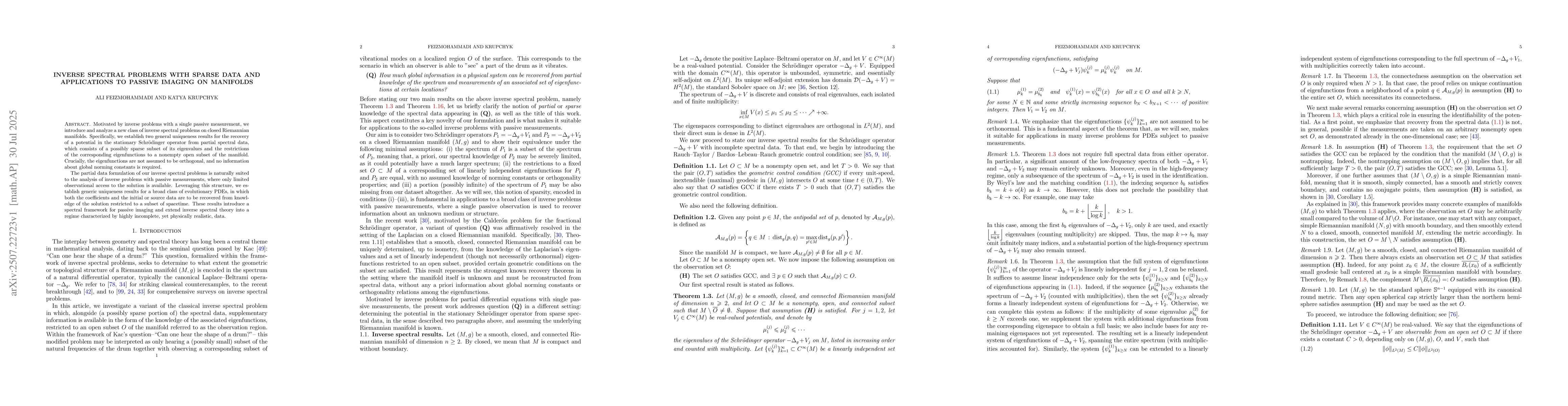 This research extends inverse spectral theory to scenarios with sparse data, which is relevant for practical applications where measurements are limited, such as in passive imaging on manifolds.
