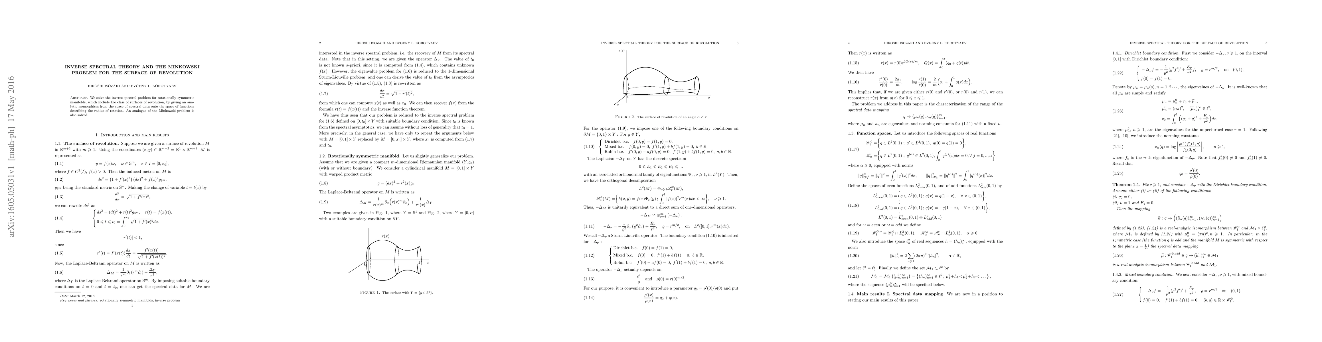 We solve the inverse spectral problem for rotationally symmetric manifolds, which include the class of surfaces of revolution, by giving an analytic isomorphism from the space of spectral data onto the space of functions describing the radius of rotation. An analogue of the Minkowski problem is also solved.