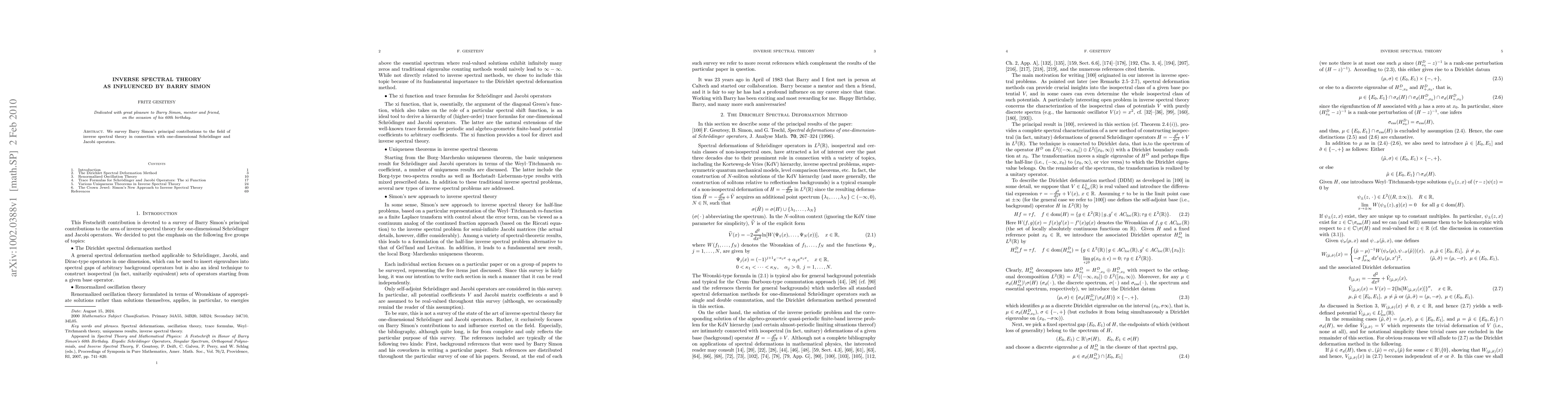 We survey Barry Simon's principal contributions to the field of inverse spectral theory in connection with one-dimensional Schrodinger and Jacobi operators.