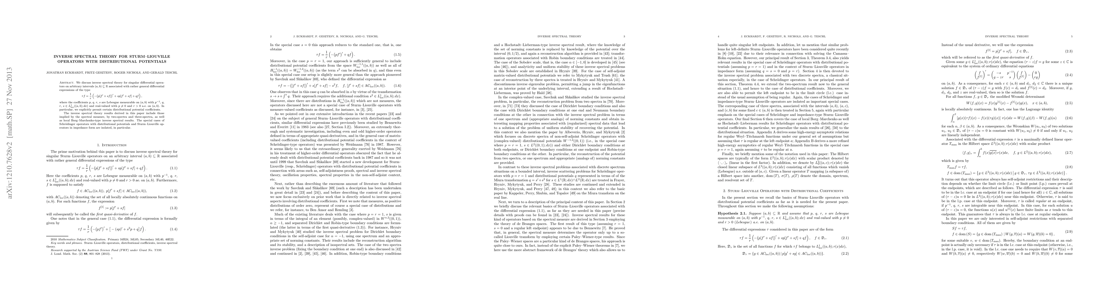 We discuss inverse spectral theory for singular differential operators on arbitrary intervals $(a,b) \subseteq \mathbb{R}$ associated with rather general differential expressions of the type \[\tau f = \frac{1}{r} \left(- \big(p[f' + s f]\big)' + s p[f' + s f] + qf\right), \] where the coefficients $p$, $q$, $r$, $s$ are Lebesgue measurable on $(a,b)$ with $p^{-1}$, $q$, $r$, $s \in L^1_{\text{loc}}((a,b); dx)$ and real-valued with $p\not=0$ and $r>0$ a.e.\ on $(a,b)$. In particular, we explicitly permit certain distributional potential coefficients. The inverse spectral theory results derived in this paper include those implied by the spectral measure, by two-spectra and three-spectra, as well as local Borg-Marchenko-type inverse spectral results. The special cases of Schr\"odinger operators with distributional potentials and Sturm--Liouville operators in impedance form are isolated, in particular.