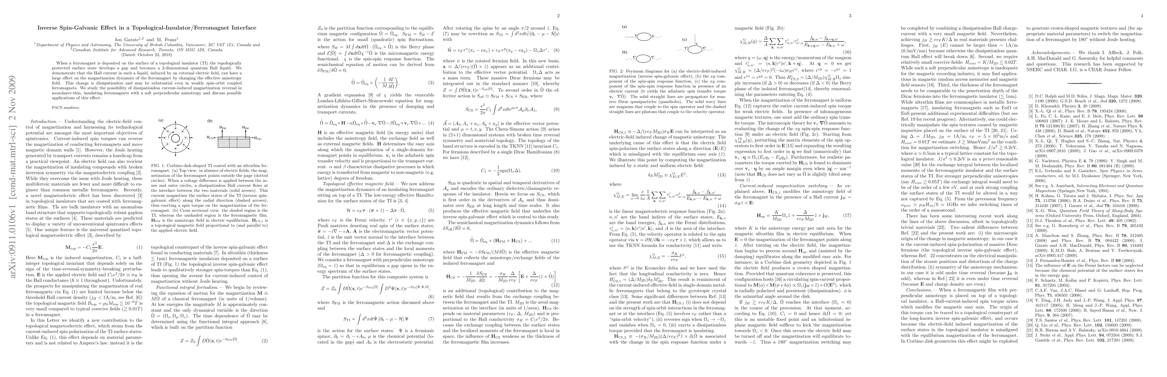 This paper investigates the inverse spin-galvanic effect at the interface between a topological insulator and a ferromagnet, demonstrating that an electric field-induced Hall current in the topological insulator can significantly influence the magnetization dynamics of the ferromagnet, potentially enabling dissipationless current-induced magnetization reversal in ultrathin insulating ferromagnets. The findings suggest promising applications for this effect.