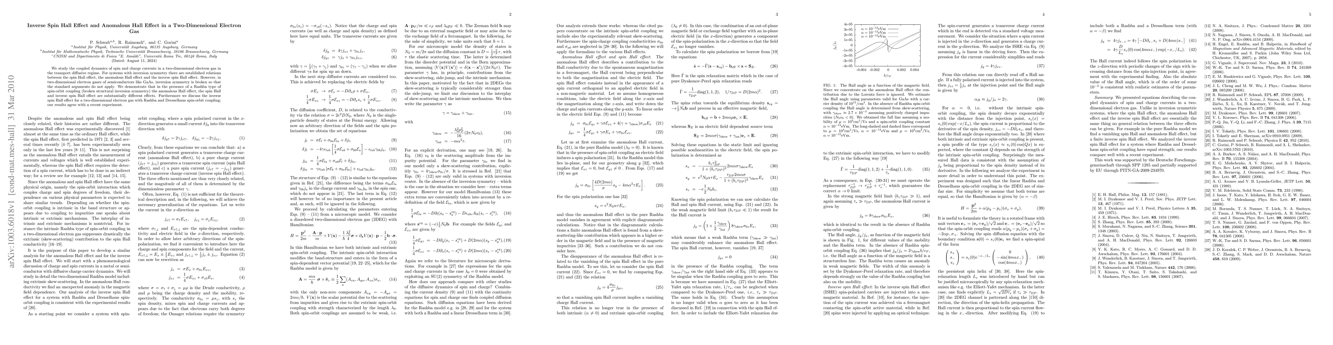 We study the coupled dynamics of spin and charge currents in a two-dimensional electron gas in the transport diffusive regime. For systems with inversion symmetry there are established relations between the spin Hall effect, the anomalous Hall effect and the inverse spin Hall effect. However, in two-dimensional electron gases of semiconductors like GaAs, inversion symmetry is broken so that the standard arguments do not apply. We demonstrate that in the presence of a Rashba type of spin-orbit coupling (broken structural inversion symmetry) the anomalous Hall effect, the spin Hall and inverse spin Hall effect are substantially different effects. Furthermore we discuss the inverse spin Hall effect for a two-dimensional electron gas with Rashba and Dresselhaus spin-orbit coupling; our results agree with a recent experiment.