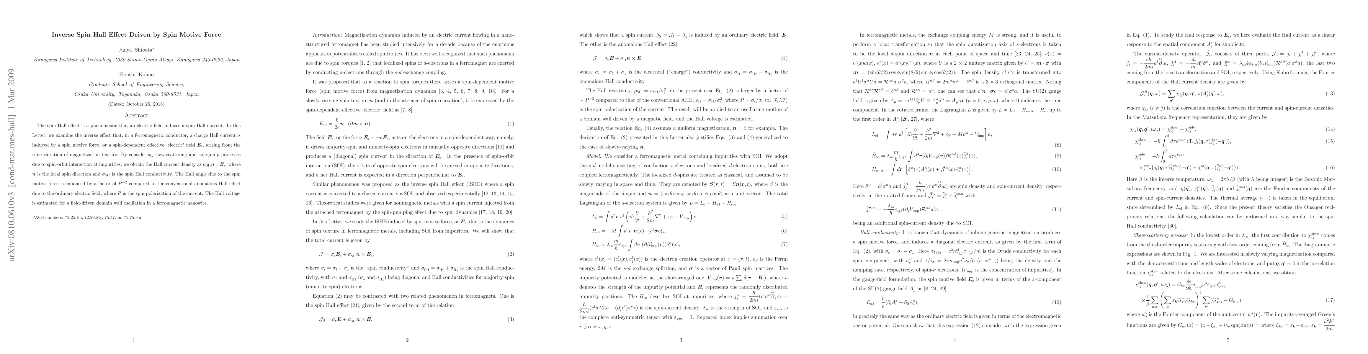 This paper investigates the inverse spin Hall effect where a charge Hall current is generated in a ferromagnetic conductor by a spin motive force, induced by the time variation of magnetization texture. The effect is described by a Hall current density proportional to the spin Hall conductivity and the spin motive force, with the Hall angle significantly amplified compared to the anomalous Hall effect.