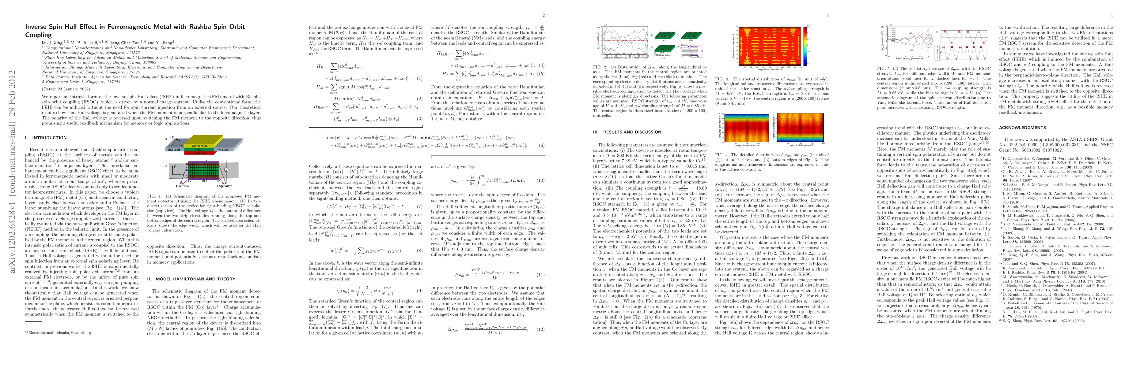 This paper reports an intrinsic inverse spin Hall effect (ISHE) in ferromagnetic metals with Rashba spin-orbit coupling, driven by a normal charge current. The generated Hall voltage polarity reverses when the FM moment direction is switched, indicating potential for memory or logic applications.
