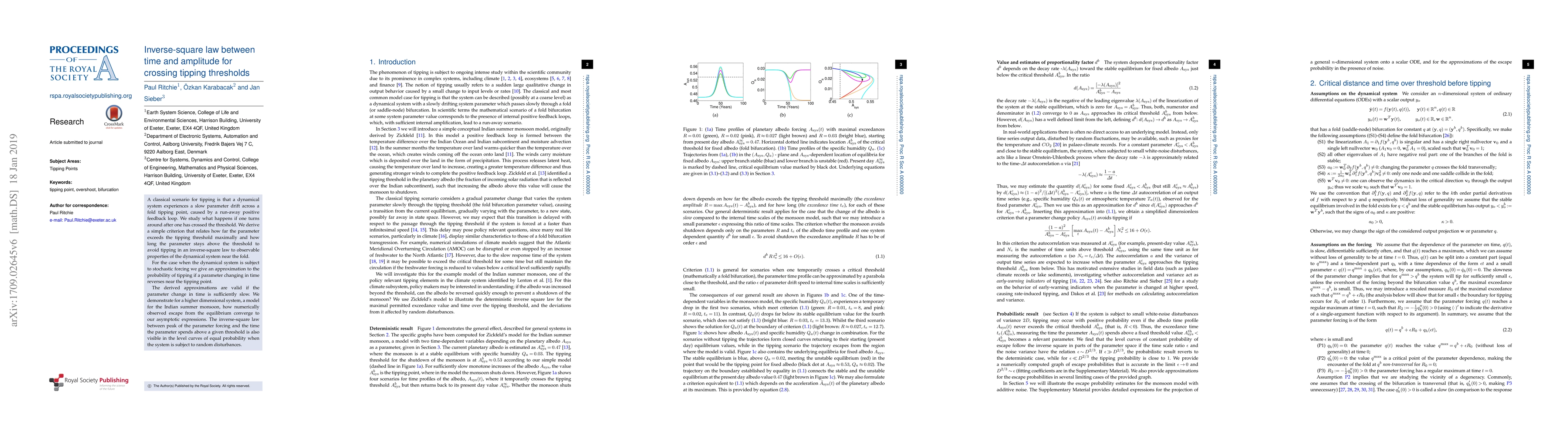 A study reveals an inverse-square law between time and amplitude for crossing tipping thresholds in dynamical systems, showing that the longer a system stays above its threshold, the less likely it is to tip.