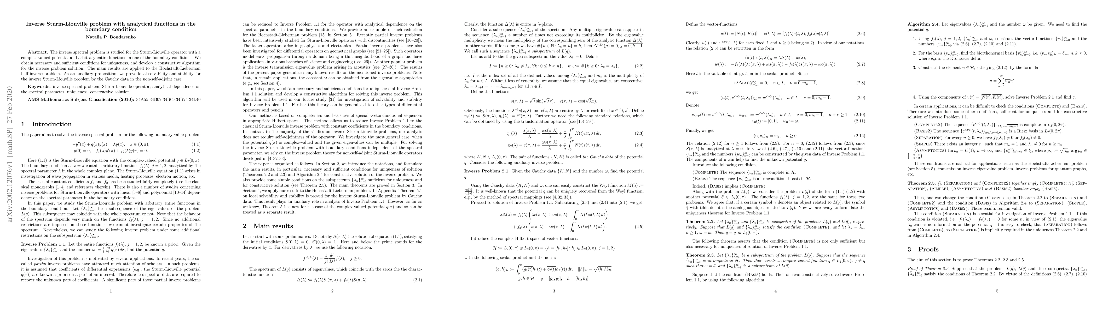 This paper investigates the inverse Sturm-Liouville problem for complex-valued potentials and entire functions in boundary conditions, establishing necessary and sufficient uniqueness conditions and a solution algorithm. It also addresses the Hochstadt-Lieberman half-inverse problem and proves local solvability and stability for non-self-adjoint cases.