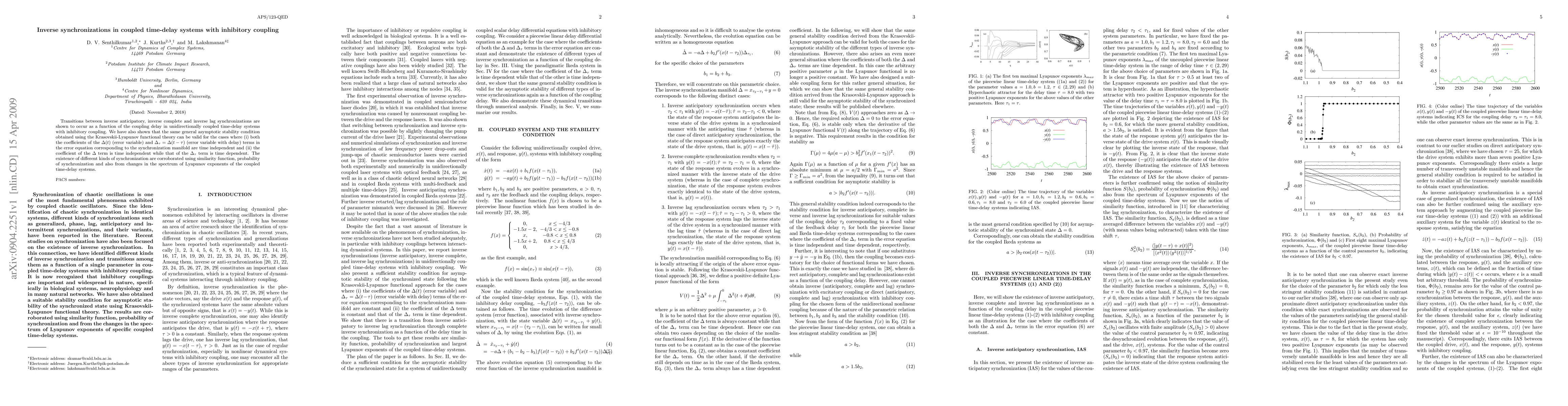 This paper investigates transitions between various types of inverse synchronizations in coupled time-delay systems with inhibitory coupling, demonstrating their dependence on coupling delay. It validates the general asymptotic stability condition using Krasovskii-Lyapunov functional theory under different time-dependence scenarios, corroborated by the similarity function, synchronization probability, and Lyapunov exponents.