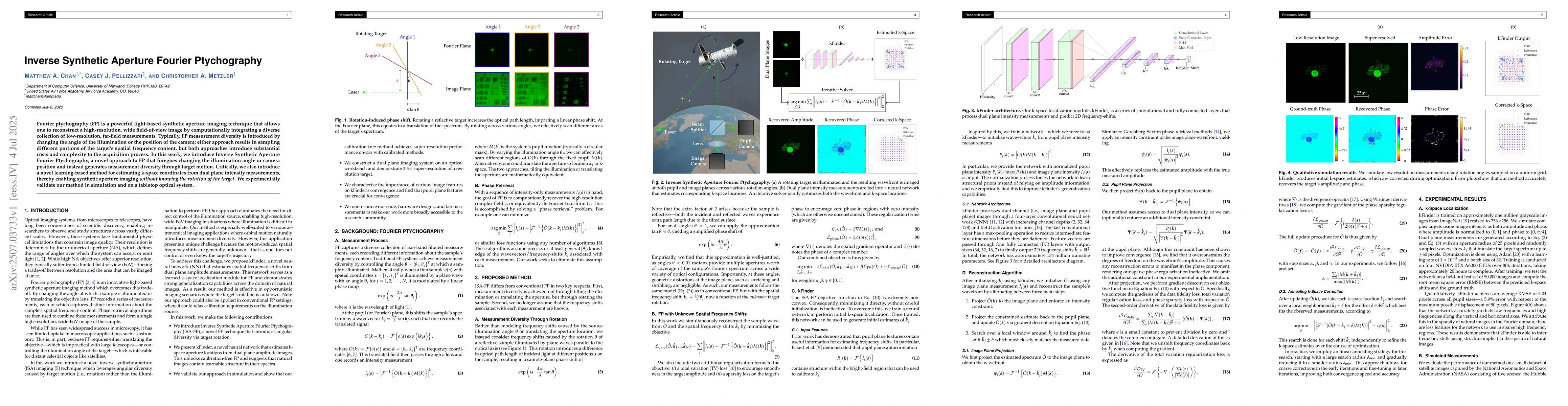Fourier ptychography (FP) is a powerful light-based synthetic aperture imaging technique that allows one to reconstruct a high-resolution, wide field-of-view image by computationally integrating a diverse collection of low-resolution, far-field measurements. Typically, FP measurement diversity is introduced by changing the angle of the illumination or the position of the camera; either approach results in sampling different portions of the target's spatial frequency content, but both approaches introduce substantial costs and complexity to the acquisition process. In this work, we introduce Inverse Synthetic Aperture Fourier Ptychography, a novel approach to FP that foregoes changing the illumination angle or camera position and instead generates measurement diversity through target motion. Critically, we also introduce a novel learning-based method for estimating k-space coordinates from dual plane intensity measurements, thereby enabling synthetic aperture imaging without knowing the rotation of the target. We experimentally validate our method in simulation and on a tabletop optical system.