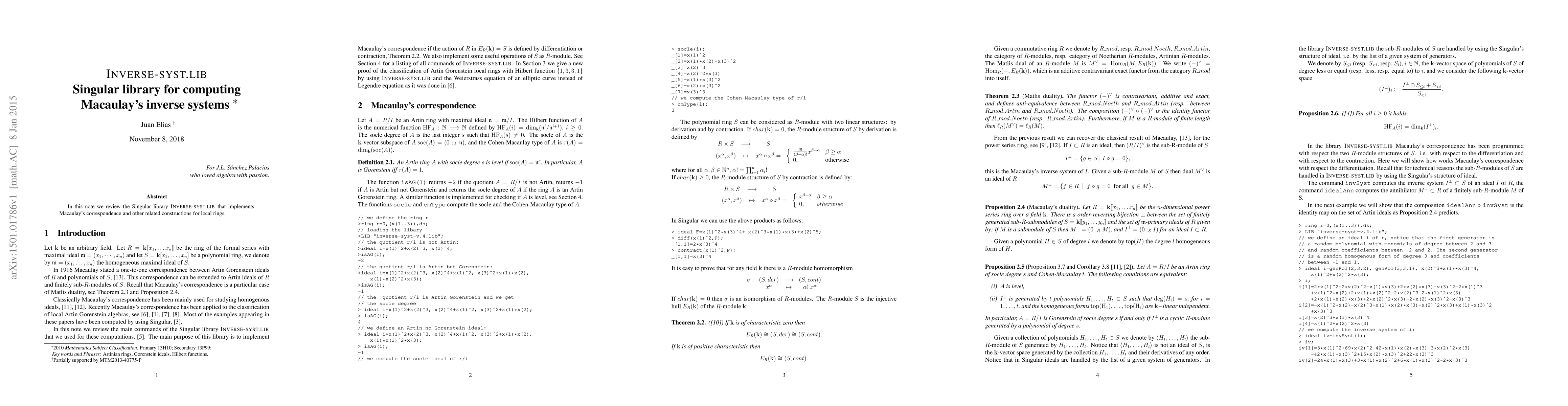 Summary: This paper reviews the Singular library Inverse-syst.lib, which implements Macaulay's correspondence and related constructions for local rings, facilitating computations in algebraic geometry. The library enhances computational capabilities for inverse systems in commutative algebra.