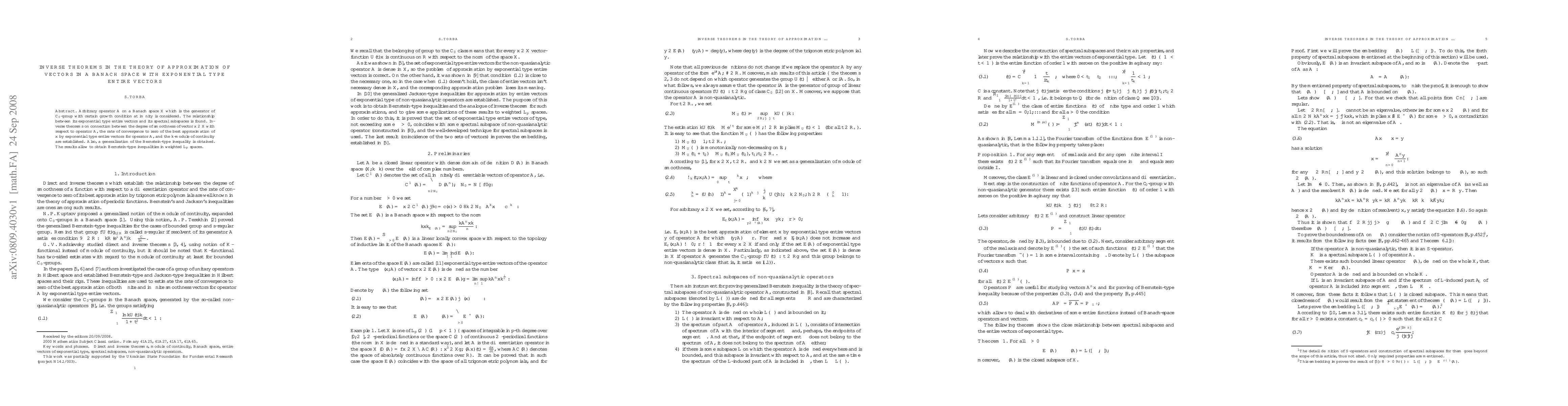Arbitrary operator A on a Banach space X which is the generator of C_0-group with certain growth condition at infinity is considered. The relationship between its exponential type entire vectors and its spectral subspaces is found. Inverse theorems on connection between the degree of smoothness of vector $x\in X$ with respect to operator A, the rate of convergence to zero of the best approximation of x by exponential type entire vectors for operator A, and the k-module of continuity are established. Also, a generalization of the Bernstein-type inequality is obtained. The results allow to obtain Bernstein-type inequalities in weighted L_p spaces.