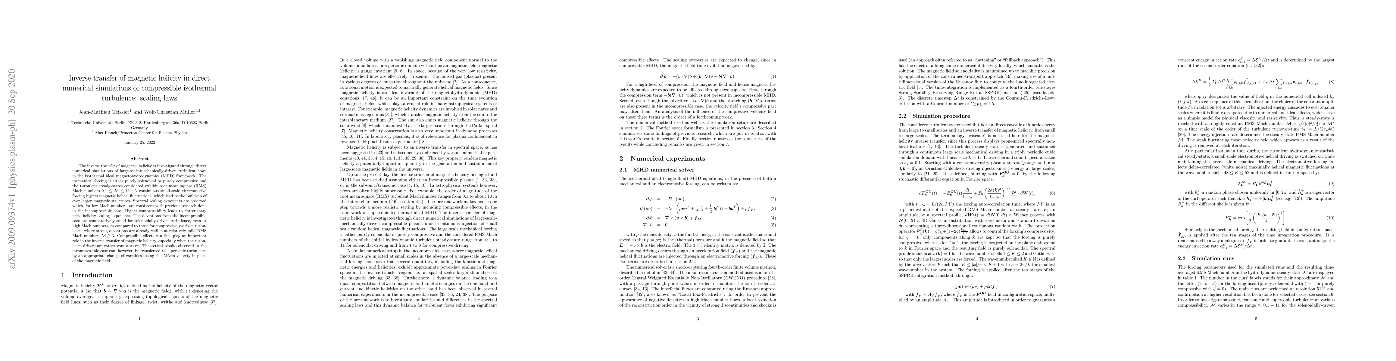 This study investigates the inverse transfer of magnetic helicity in compressible isothermal turbulence via direct numerical simulations, revealing scaling laws that differ based on the nature of mechanical forcing. While low Mach numbers show scaling consistent with incompressible MHD, higher compressibility leads to flatter scaling exponents, especially for compressively-driven turbulence.