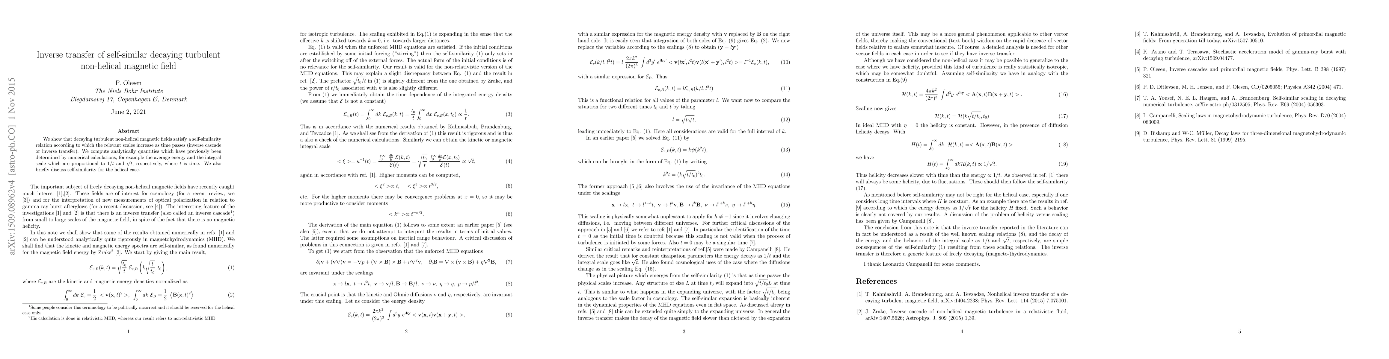 This paper demonstrates that decaying turbulent non-helical magnetic fields exhibit self-similarity, characterized by an inverse cascade where scales increase over time. Analytical expressions for average energy and integral scale are derived, showing a 1/t and √t dependence on time, respectively.